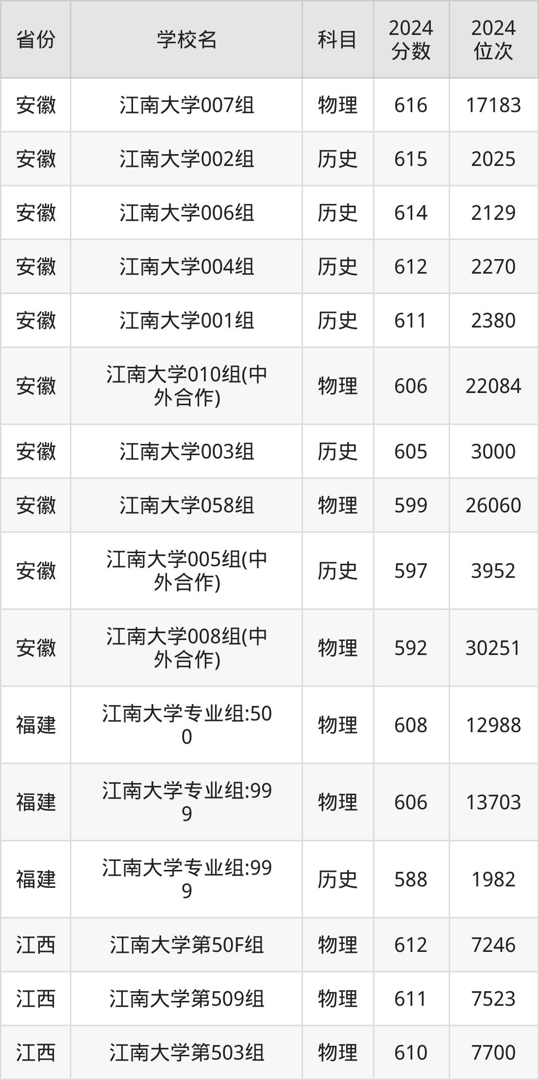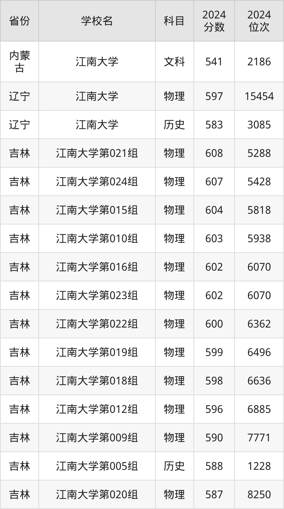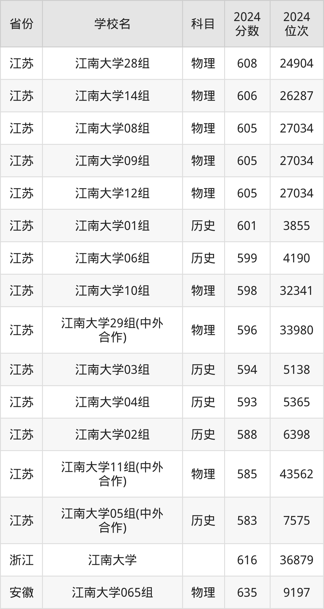 2024年江南大学在江苏省内录取最低分数线是583分,录取最低的是历史类05组(中外合作);录取分数线最高是631分,对应的是物理类18组。
