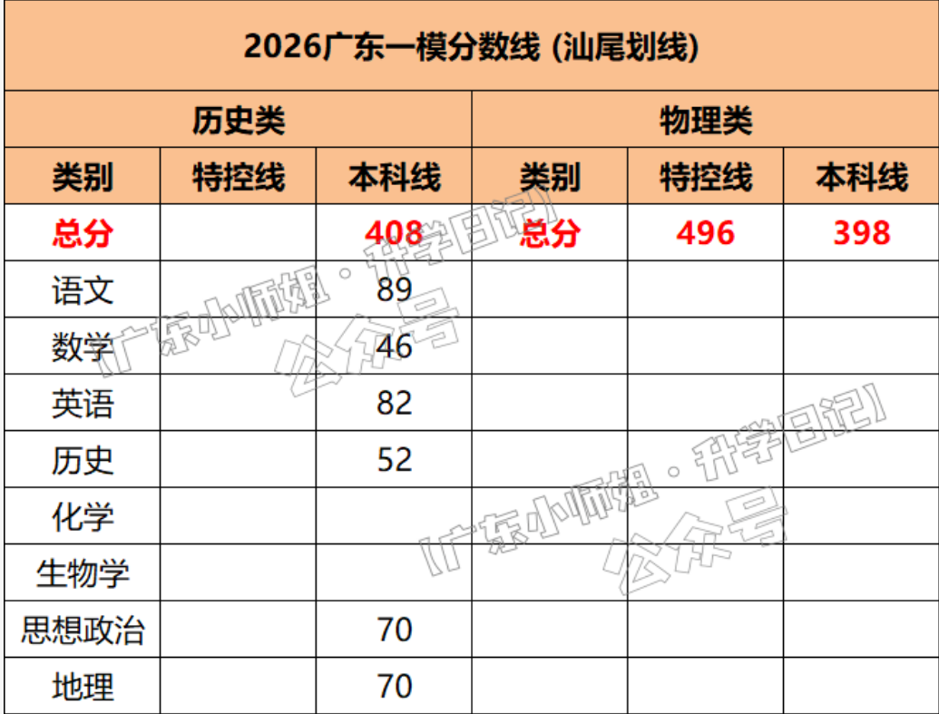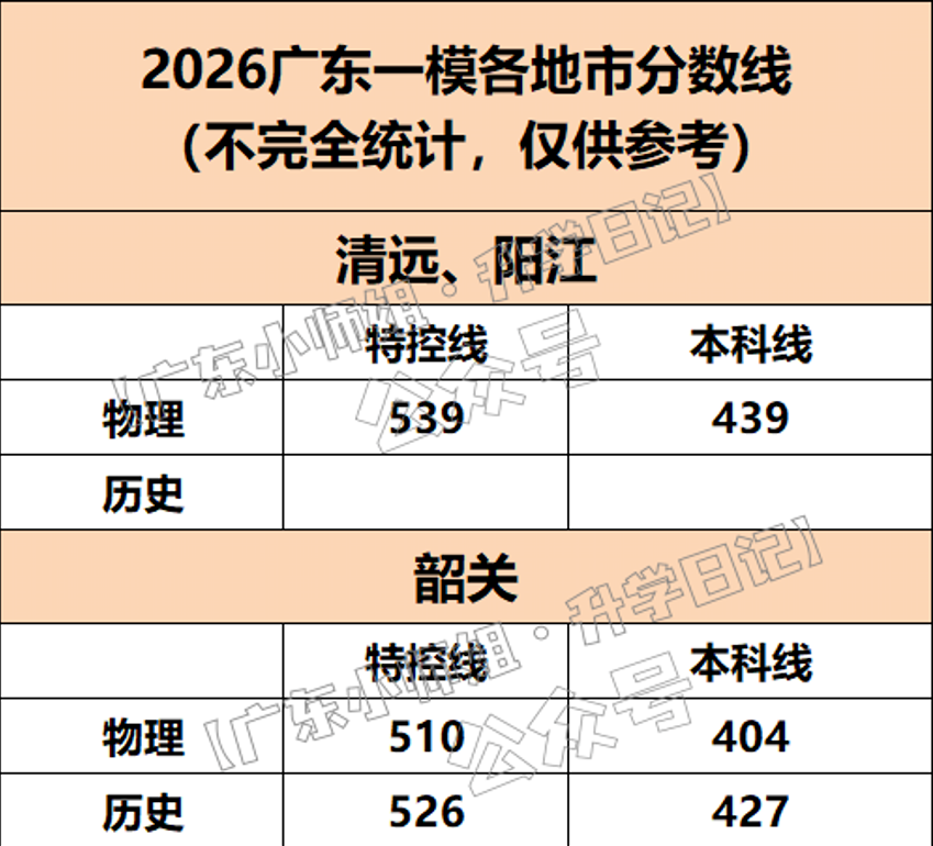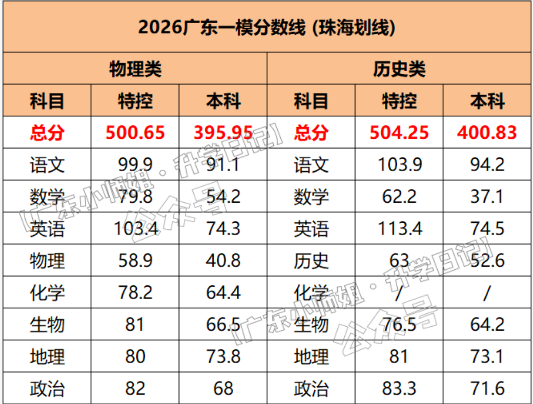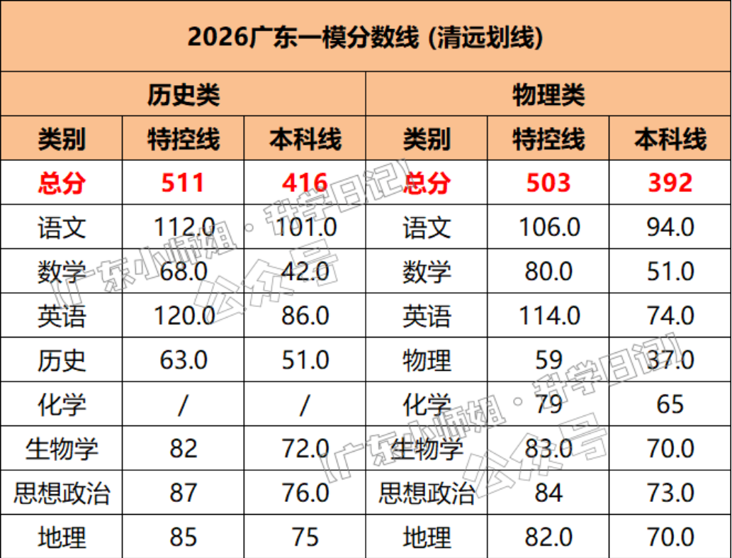 2026年广东一模分数线已陆续公布。从目前已公布的数据来看,各地市之间存在一定差异。例如,历史类特控线为511分,本科线为416分;物理类特控线为503分,本科线为392分。整体来看,各地分数线与往年相比波动不大,但区域差异仍然明显。