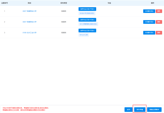 志愿填写完成后,考生需要点击“保存草稿”按钮进行保存。如果没有保存,已填写的志愿信息可能无法保留,因此保存是非常重要的一步。