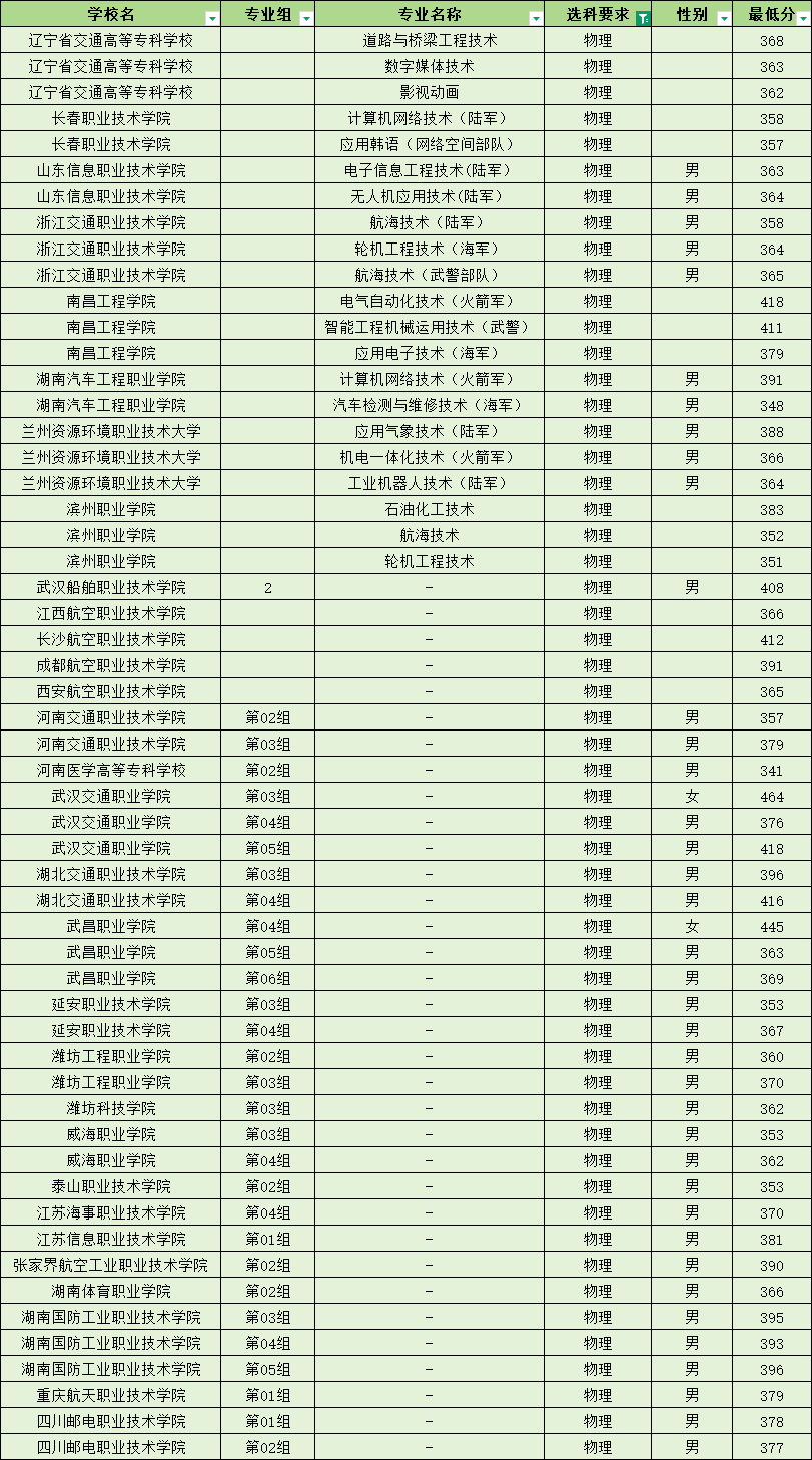 2025年湖北定向士官学校有辽宁省交通高等专科学校、长春职业技术学院、山东信息职业技术学院等。2024年历史类录取分数线在296分至439分之间,最高为武昌职业学院(第01组,女)439分;物理类录取分数线在341分至464分之间,最高为武汉交通职业学院(第03组,女)464分。