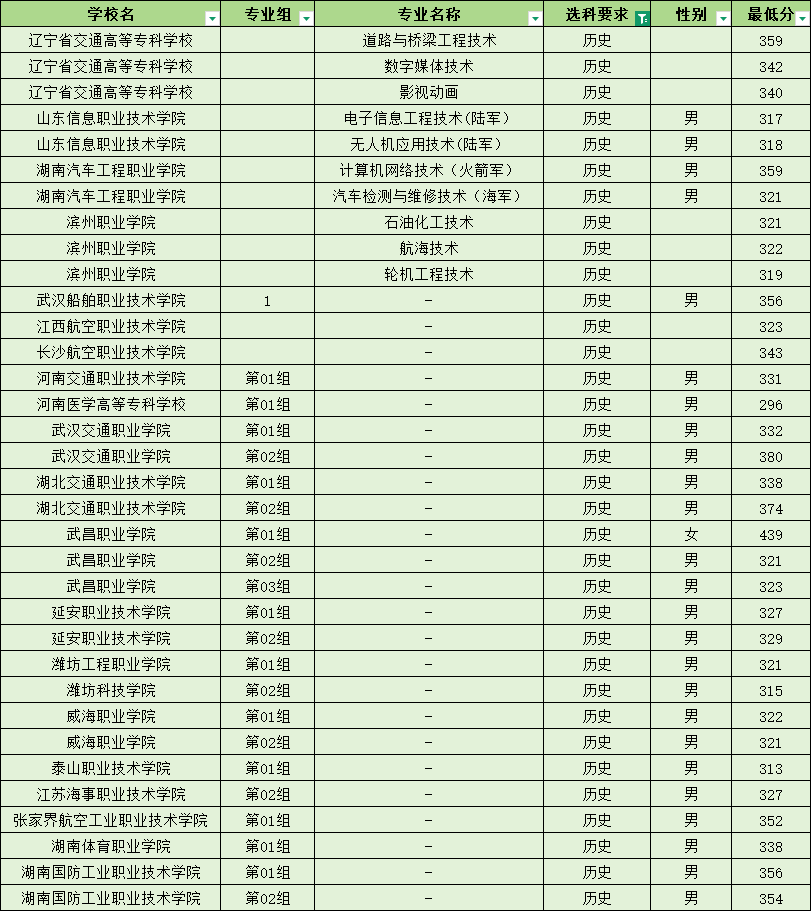 其余历史类投档分数主要集中在320–374分之间,例如: