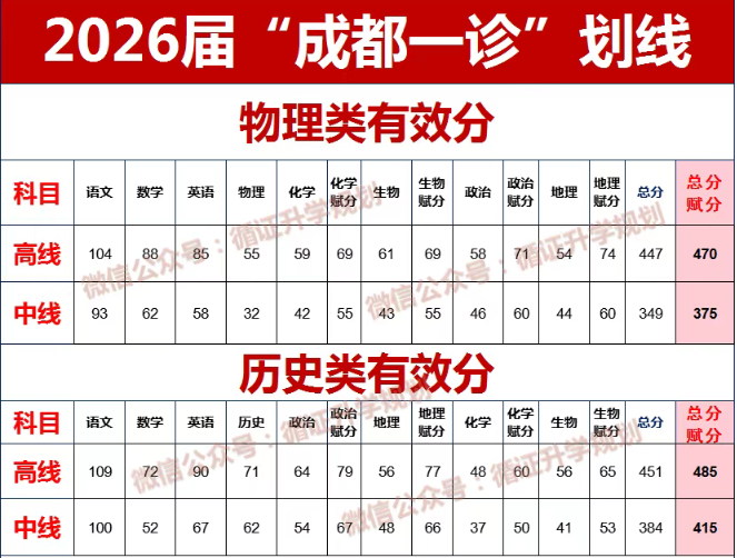 2026成都高三一诊分数线已正式公布!物理类本科分数线为高线470分、中线375分,历史类本科分数线为高线485分、中线415分。同时,本文将对物理类和历史类各科赋分进行详细解析,并结合一分一段表分析位次,为后续复习提供参考。