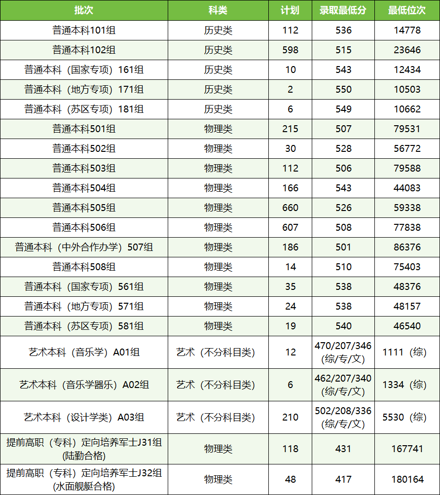 历史类最低录取分数线515分(位次23646),物理类最低录取分数线506分(位次79588)。2024年国家专项物理类最低分538分(位次48376),较普通类低14分;苏区专项历史类最低分549分(位次10662),较普通类低34分。