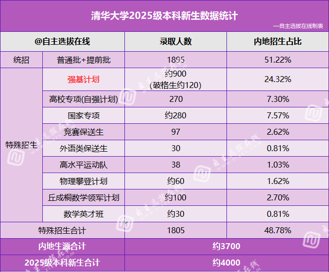 清华大学是“双一流”A类高校,在QS世界大学排名中稳居亚洲前列。强基计划作为清华特殊招生占比最高的渠道(2025年招生900人,占内地总招生25.7%),能享受最优质的师资、科研资源和跨学科培养机会。