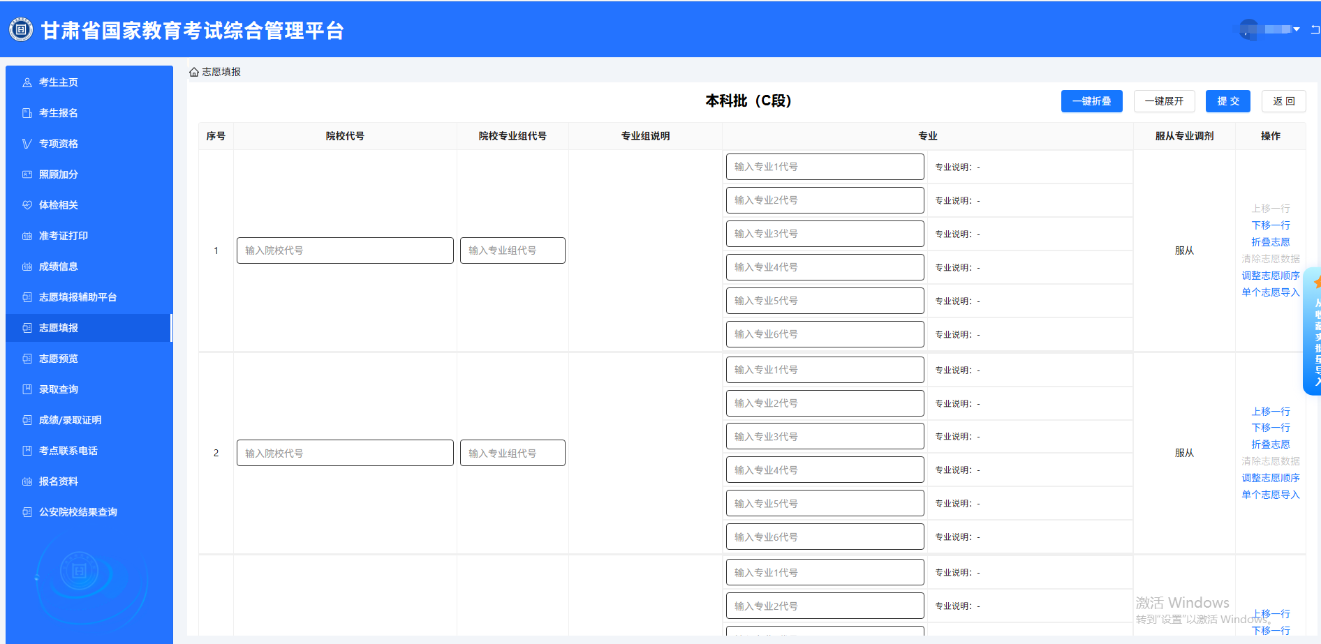 本科批C段:平行志愿,设置45个院校专业组,每组含6个专业及调剂选项。涵盖普通类、民族班、国家专项等计划,是本科录取的“主战场”。志愿样表如下: