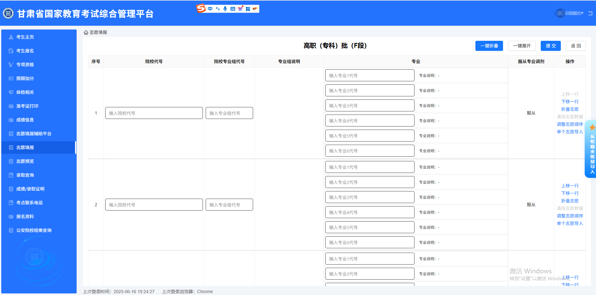 高职(专科)批F段:平行志愿,45个院校专业组,侧重技能型专业(如护理、信息技术)。志愿样表如下: