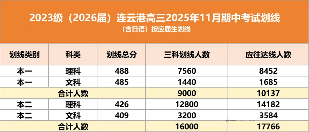 2026届江苏高三学生正处于高考备战的关键时期,11月期中考试作为重要的阶段性检测,全省各地市正陆续开展。其中,连云港市本科线分别是物理类426分、历史类409分;淮安市本科线为物理类416.5分、历史类450分。