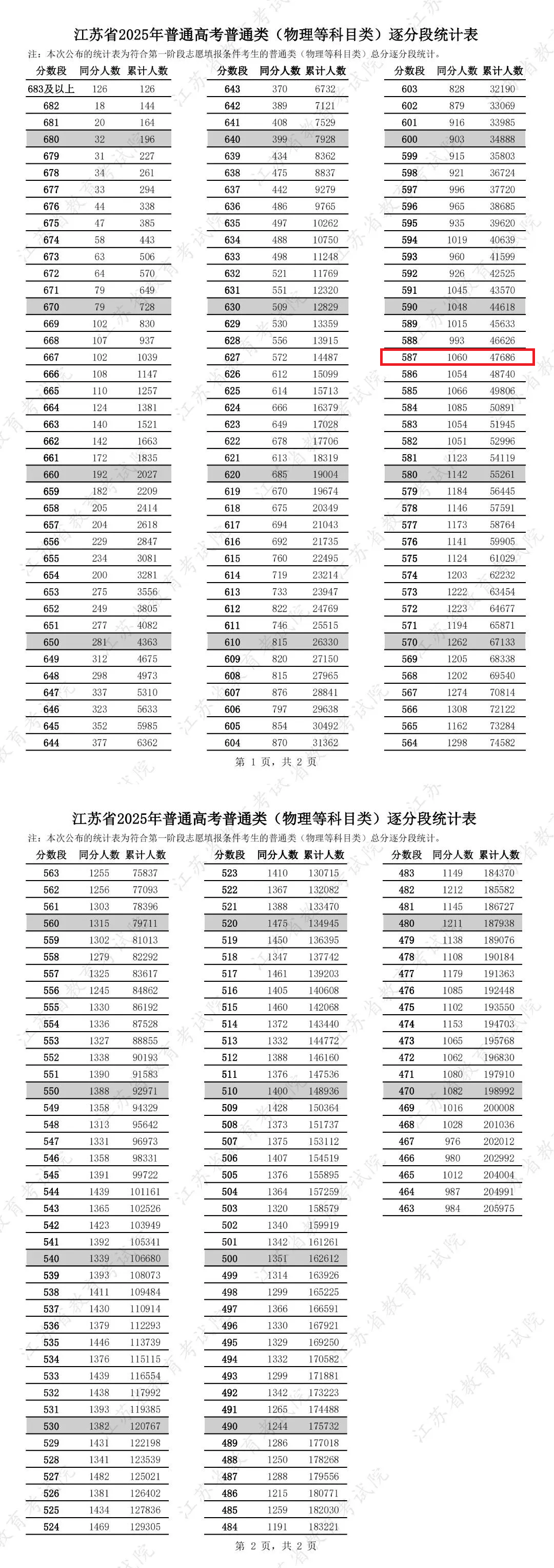 用换算得到的高考参照分(如587分),查找2025年江苏省高考一分一段表,确定对应位次。例如,587分在2025年高考中对应全省约47686位次。这样,小明同学就能了解自己在全省的竞争位置。