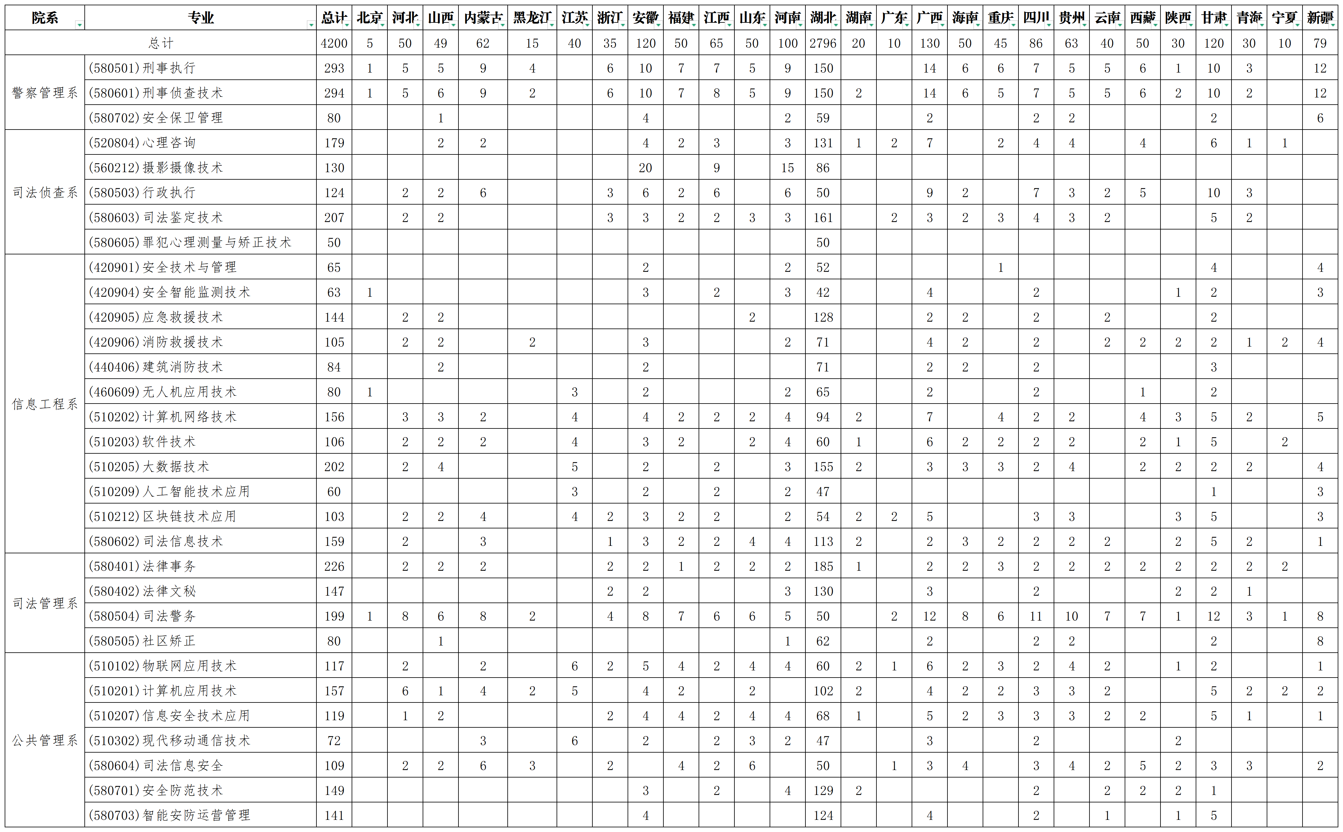 武汉警官职业学院2025年招生计划共4200人。其中、省内招生2796、省外1404人。