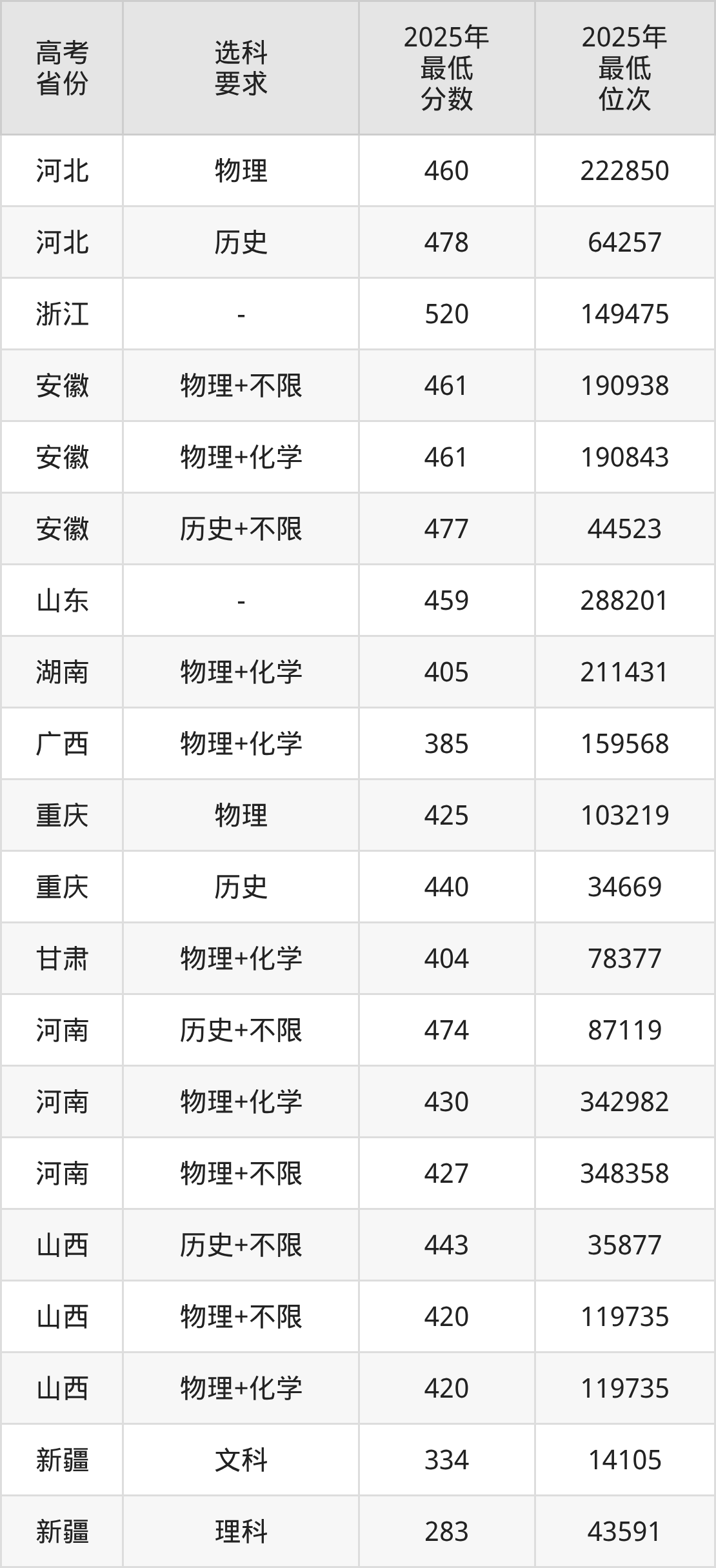 在2025年新疆高考理科招生时,公办本科收分最低的是兴安职业技术大学,最低分是148分、位次是52507位。再看陕西科技大学镐京学院,2025年在新疆理科的最低录取分数线是283分,最低位次是43591位。