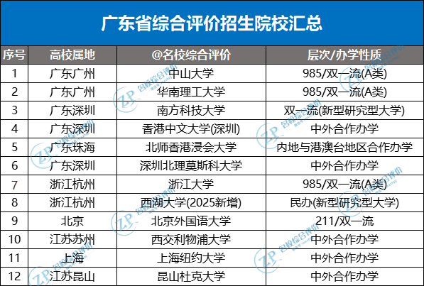 2025年,广东省的综合评价招生覆盖了省内外12所高校,其中包括多所国内知名高校。以下是参与2025年广东省综合评价招生的院校:
