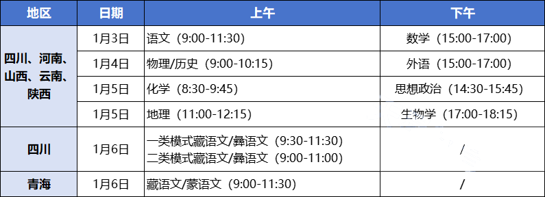 本次考试教育部负责命制语文、数学、外语 3 门科目试题,各省负责命制本省物理、历史、思想政治、地理、化学、生物学等 6 门科目试题。本次考试的考试时间如下: