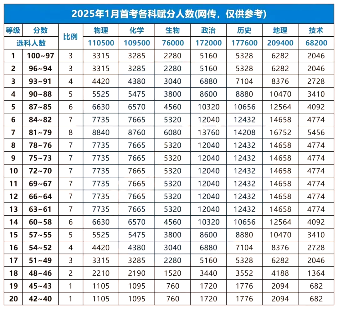 虽然官方不公布具体的赋分情况,但根据网络流传的数据,下文整理近五年的赋分对照表,考生可以更直观地了解近年来的各科目赋分趋势,从而更合理地制定备考计划。