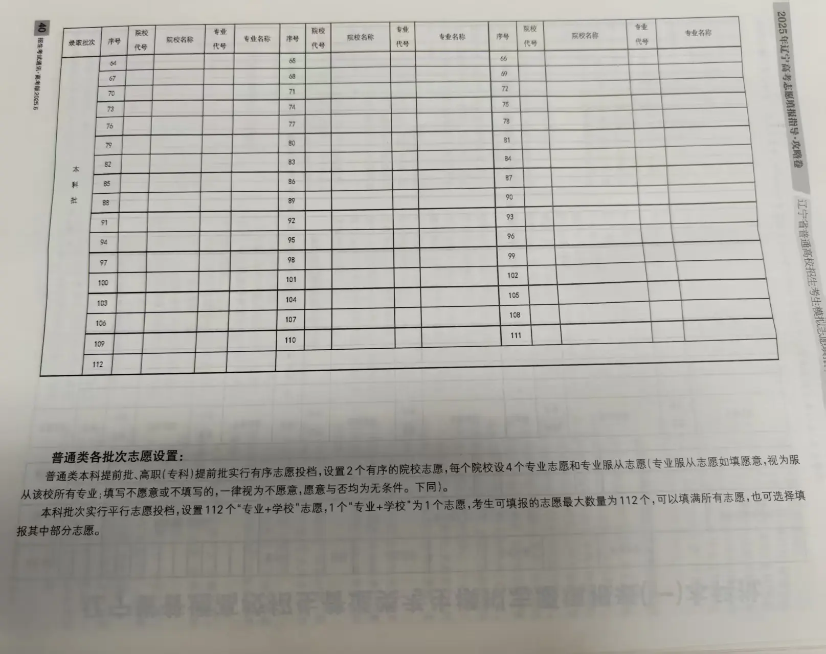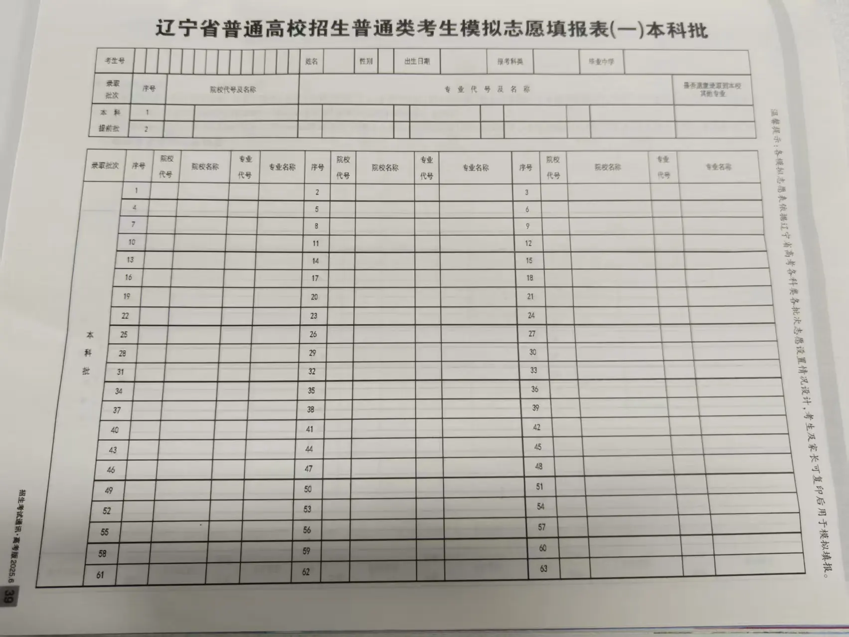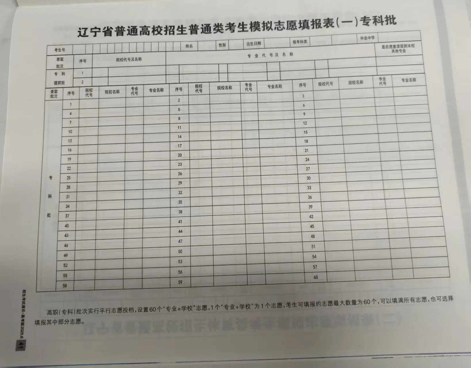 辽宁高考志愿填报表电子版(志愿样表)