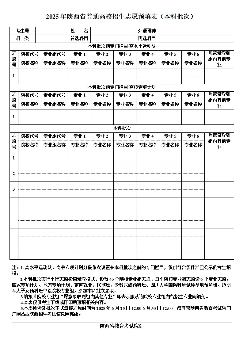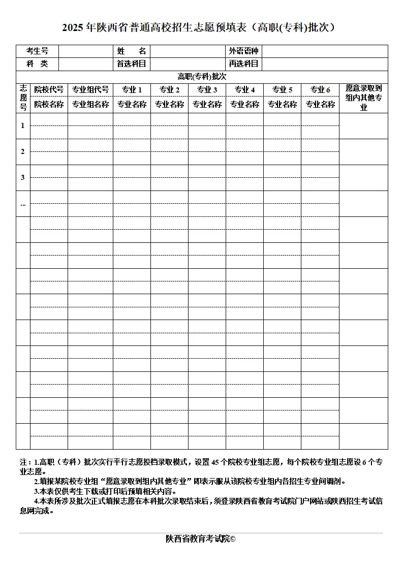 陕西高考志愿填报表电子版(志愿样表)