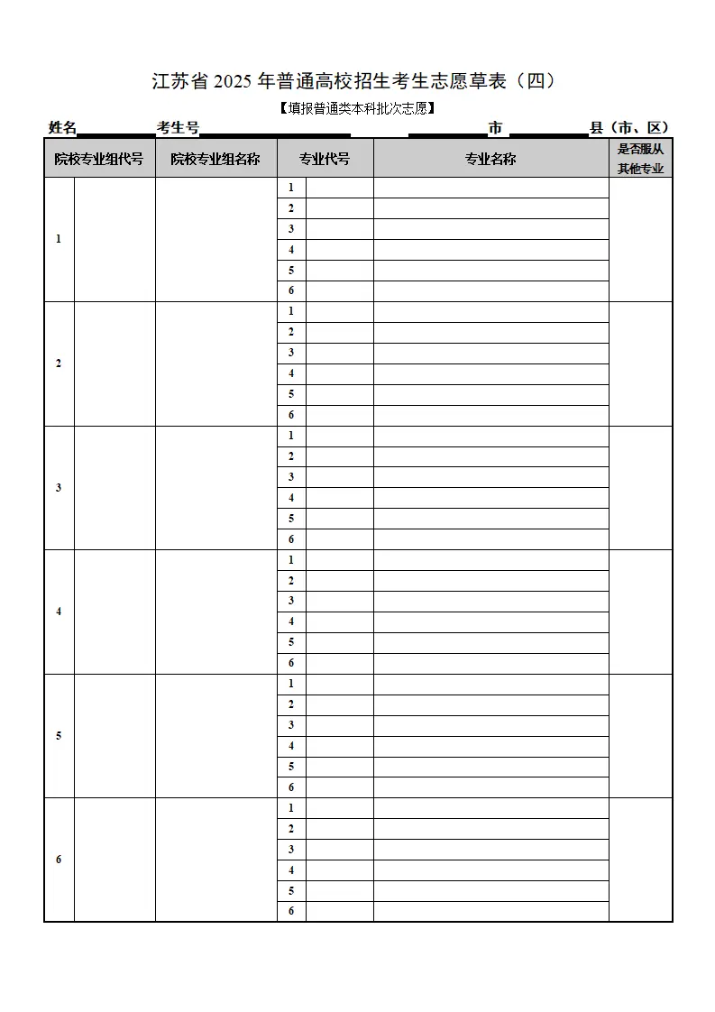 江苏高考志愿填报表电子版(志愿样表)