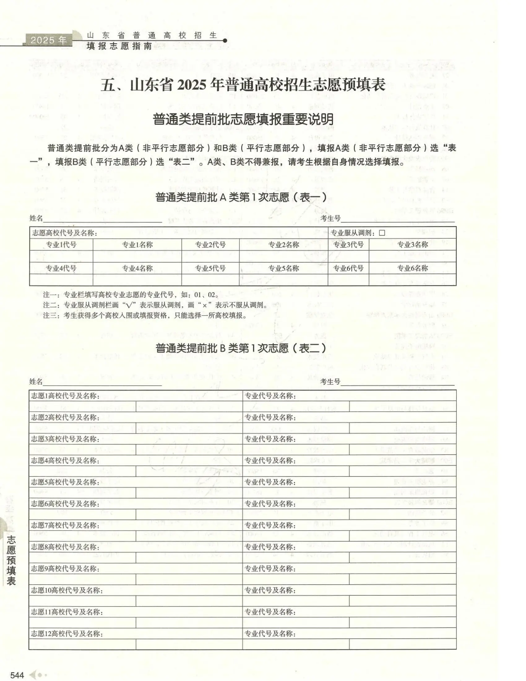 山东高考志愿填报表电子版(志愿样表)