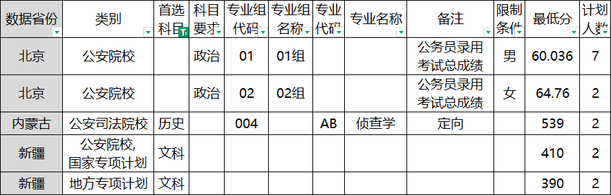 内蒙古:定向“侦查学”,录取分为 539分(计划2人),为历史类普通高考录取的主要参考分数。