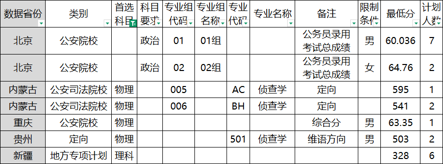 贵州:定向“侦查学(维语方向)”,仅招男生,录取分为 503分(计划2人)。分数相对适中,但附加了明确的语言学习方向。