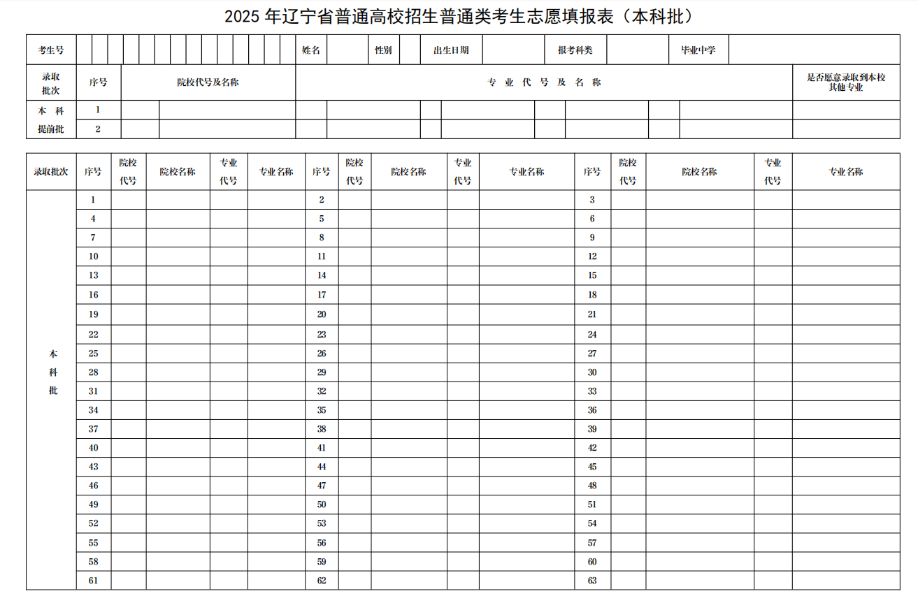 提示:由于2026年辽宁省高考志愿表尚未公布,2026届考生目前只能参考2025年志愿样表来进行模拟填报。不过,根据往年经验,2026年样表基本上不会有太大的变化,因此2025年样表仍具有较高的参考价值。