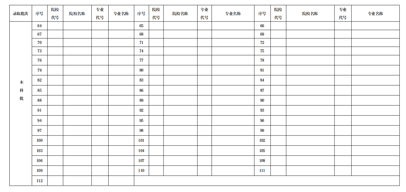 在志愿填报系统中,考生需依次填写“录取批次”“序号”“院校代号”“院校名称”“专业代号”“专业名称”等信息。本科批共112个志愿位置,从序号1至112,每个志愿对应一个院校的一个专业(类)。样表中清晰标注填报位置,考生应严格按照系统提示逐项填写,避免错填、漏填。