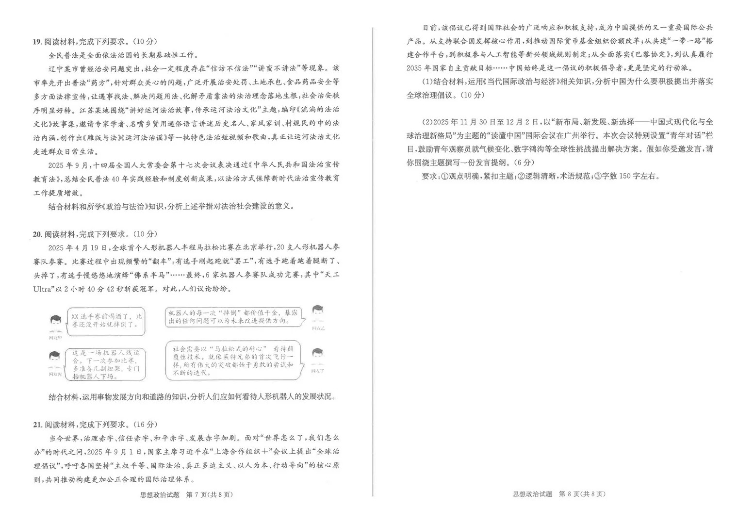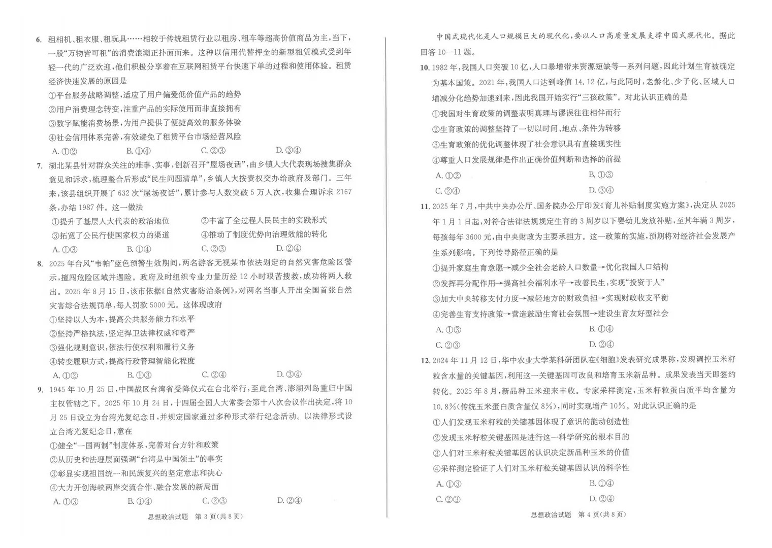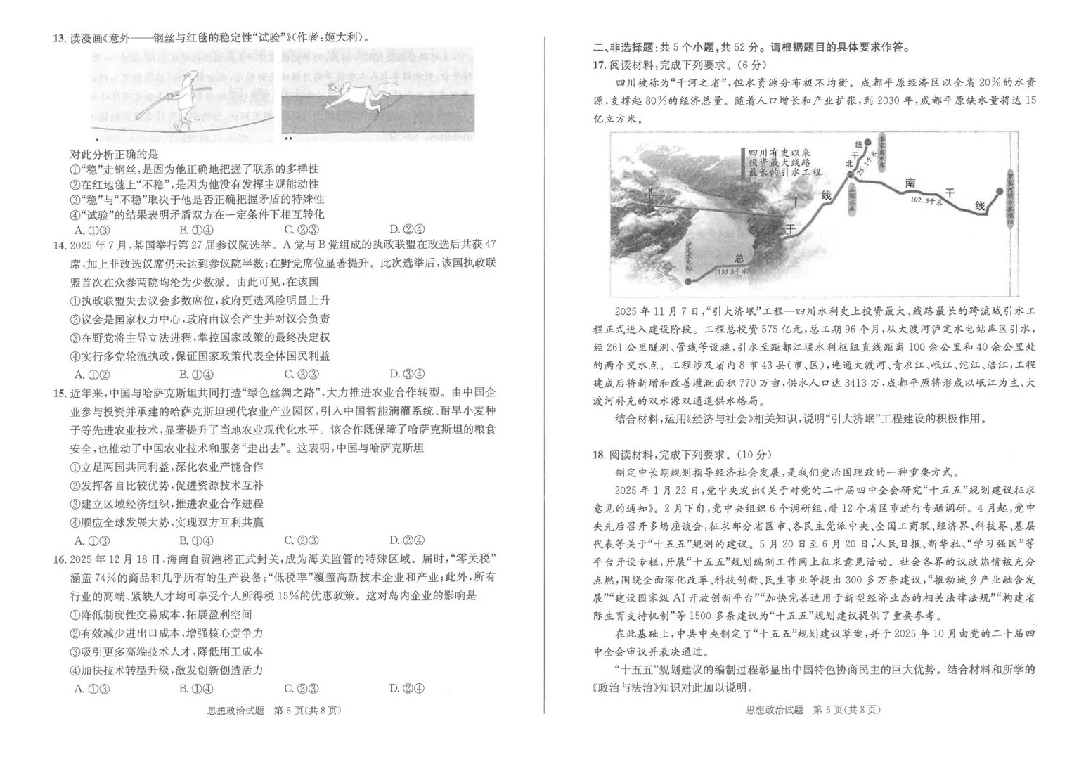 考试时间:12月24日14:30—15:45思想政治试卷围绕时事热点与教材核心理论展开,材料分析题要求考生能够将理论知识与现实问题相结合,体现较强的理论联系实际能力。