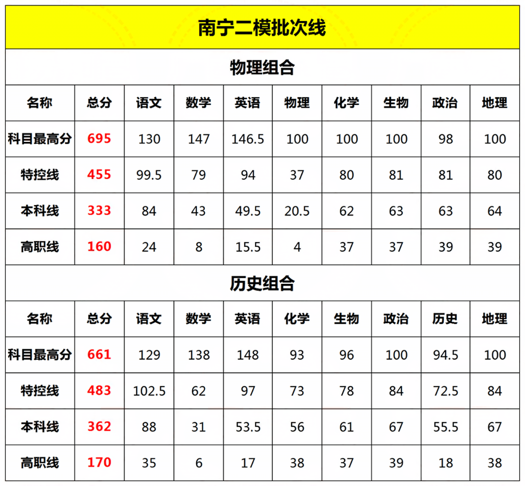 2025年3月18-20日南宁二模考试结束,公布了物理和历史组合的批次线,其中物理组特控线 455分、本科线333分、高职线160分,历史组特控线483分、本科线362分、高职线170分。