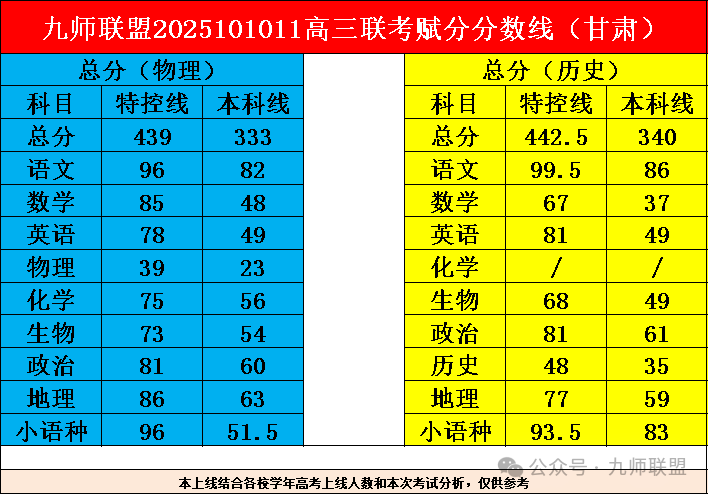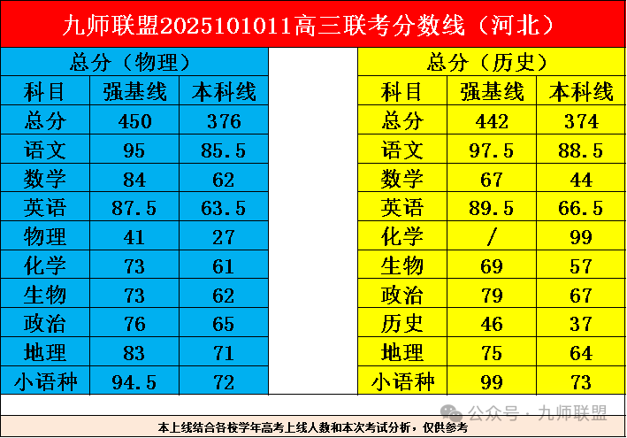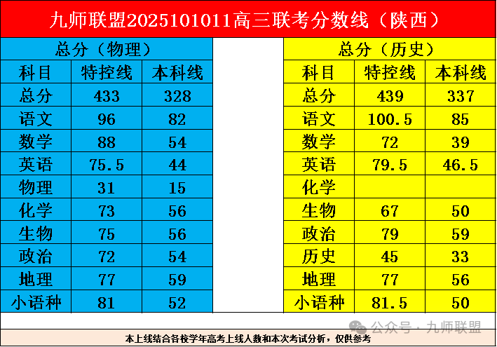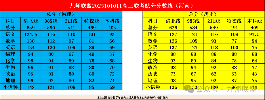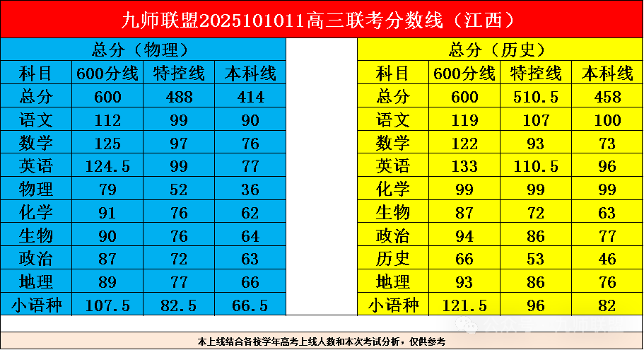 2026届九师联盟高三10月联考已于10月10日—11日圆满举行。本次考试覆盖河南、江西、河北、陕西、甘肃、黑吉辽蒙、贵州等七个区域,考试结束后,各地分数线与本科有效分数据相继发布。例如:河南物理类本科线403分,特控线469分;历史类本科线409分,特控线491分等。
