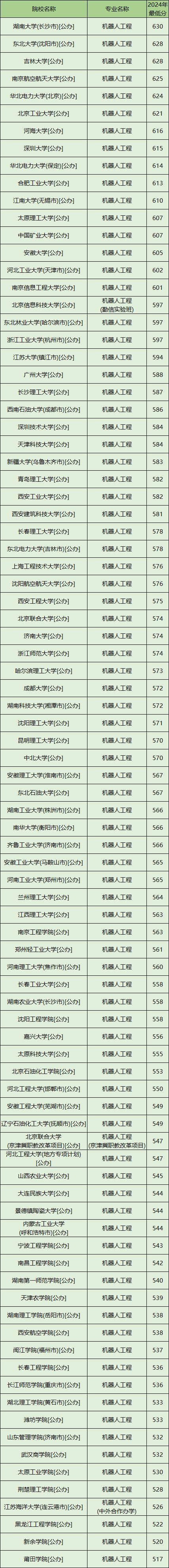 看河北2024年物理类录取结果可知:机器人工程专业收分最高的大学是湖南大学(长沙市)[公办],需要630分。机器人工程专业收分最低的本科大学是新疆理工学院[公办],需要482分。
