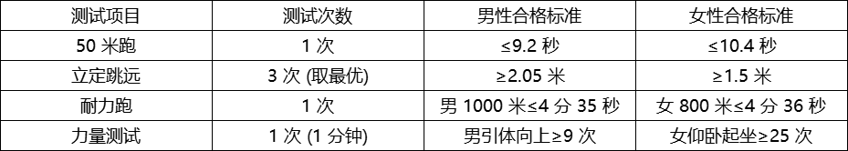 体能测评由甘肃省公安厅统一组织,4 个项目必须全部参加,3 个及以上达标方为合格,具体标准如下: