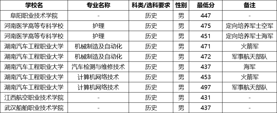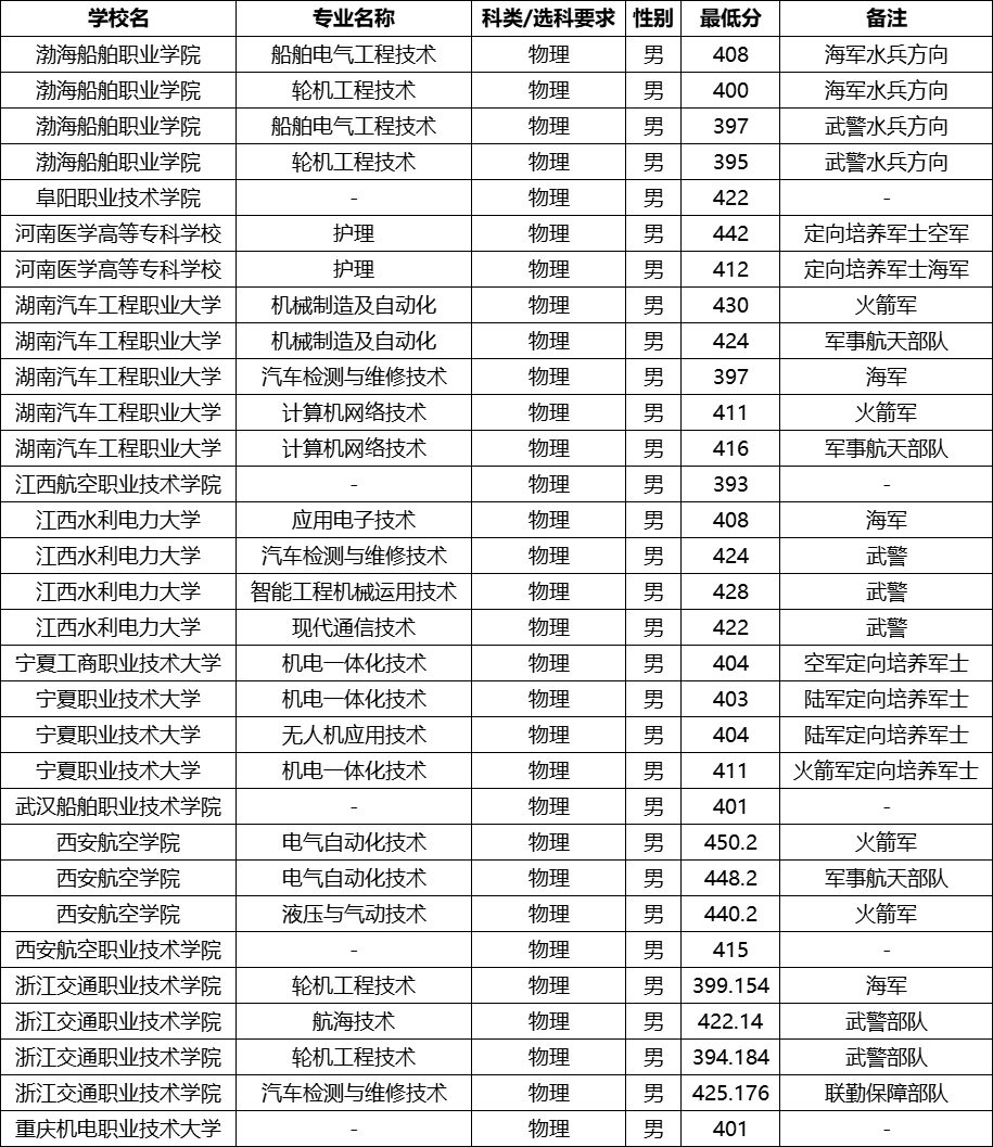 湖南汽车工程职业大学的“汽车检测与维修技术(海军)”437分和武汉船舶职业技术学院的未列明专业437分,分数要求相对亲民。
