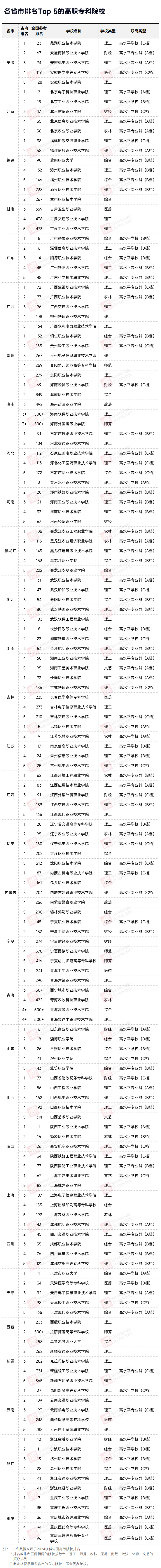 以下为全国31省市TOP5专科学校名单,供考生参考。