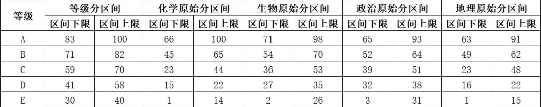 化学:A等级(前15%)对应原始分83-100分,赋分后66-100分;B等级(15%-50%)对应71-82分,赋分后45-65分;C等级(50%-85%)对应59-70分,赋分后23-44分;