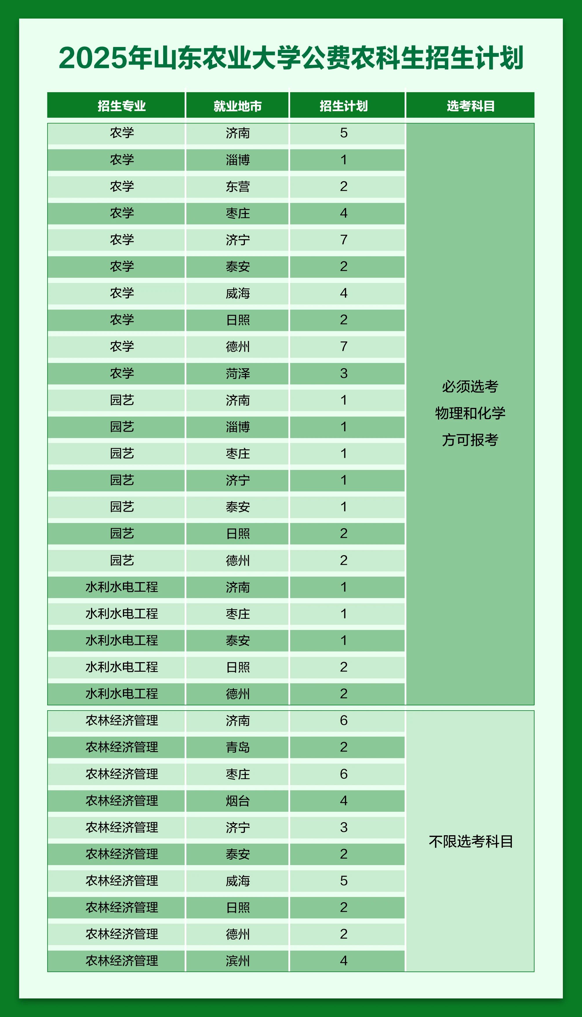 山东农业大学2025年公费农科生招生专业及人数详情如下: