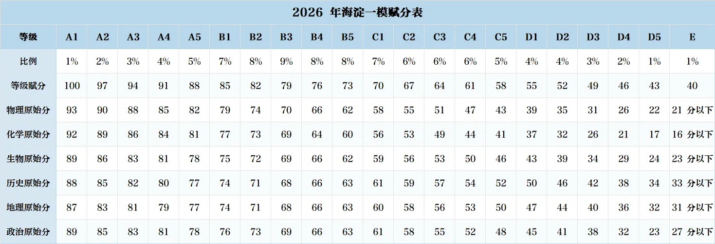 从2026年海淀一模赋分表来看,各选考科目原始分与赋分对应关系如下: