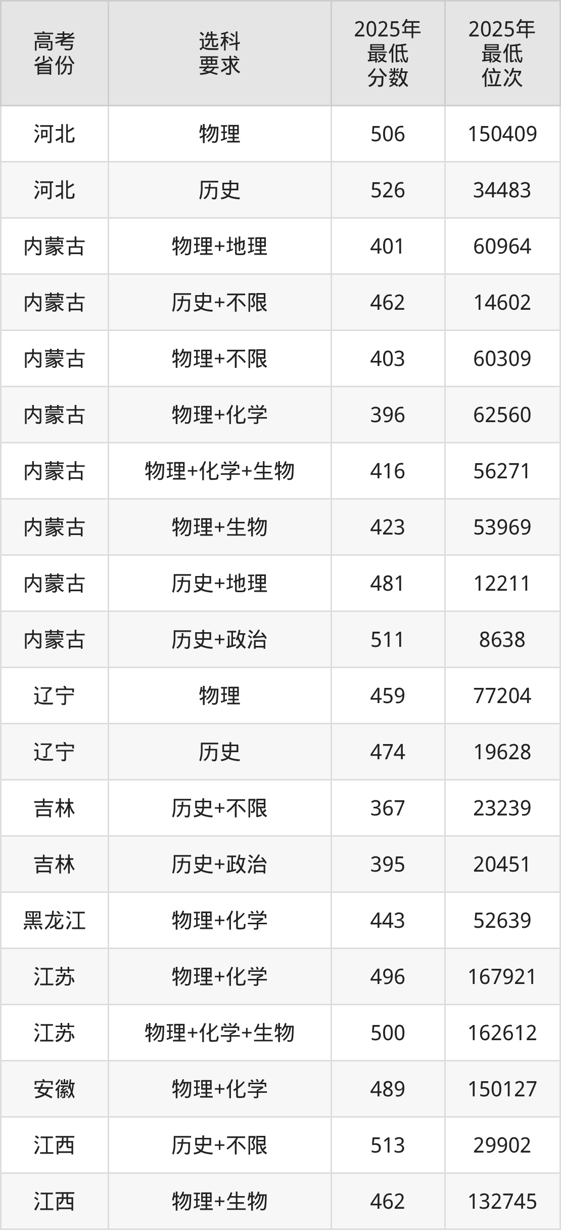 在2025年内蒙古高考物理类招生时,211收分最低的是东北林业大学第006组(中外合作),最低分是499分、位次是30054位。再看赤峰大学,2025年在内蒙古物理类的最低录取分数线是396分,最低位次是62560位。