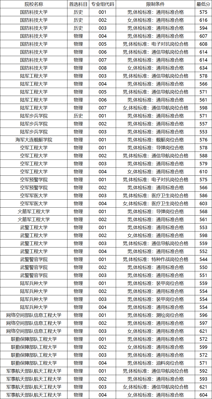 历史类男生:001专业组最低575分