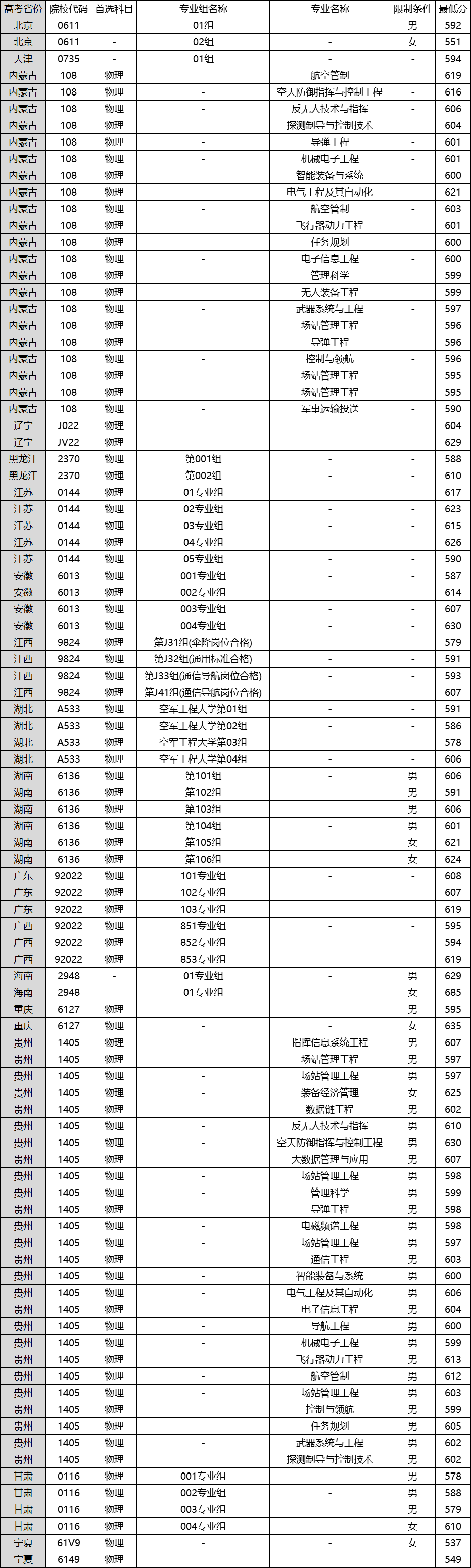 2025年空军工程大学面向黑龙江、安徽等17个省份的提前批次招生,以下是空军工程大学2024年提前批录取分数线情况,包含该校在全国各省的录取数据,供查阅。