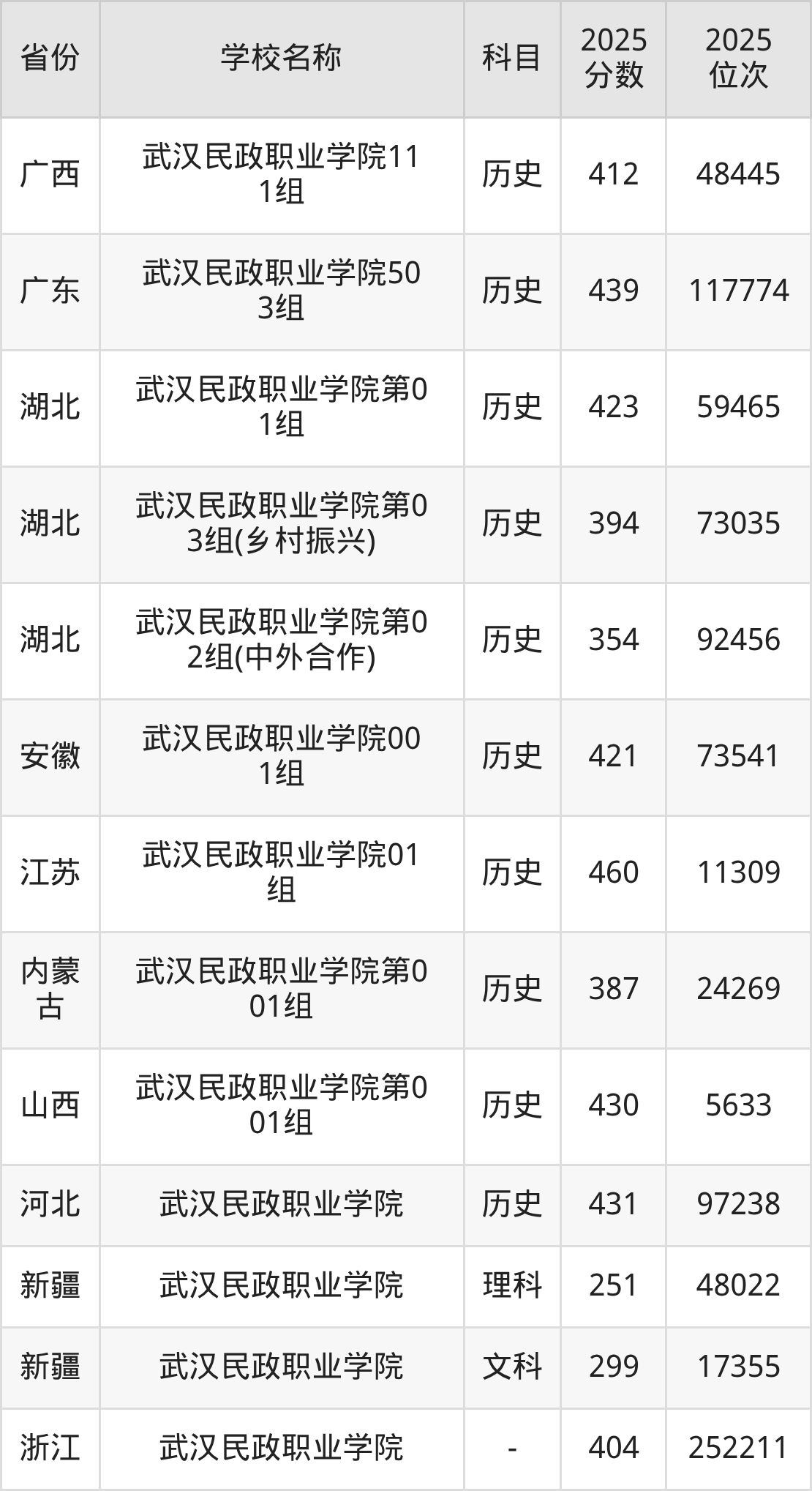 再看湖北高考2025年专科批次线,历史类是200分、物理类是200分。通过对比发现:武汉民政职业学院2025年历史类最低分比专科线高154分,物理类最低分比专科线高146分。2026届湖北高考生,可通过每一次模考划线,来判断自己的成绩是否有机会被武汉民政职业学院录取。