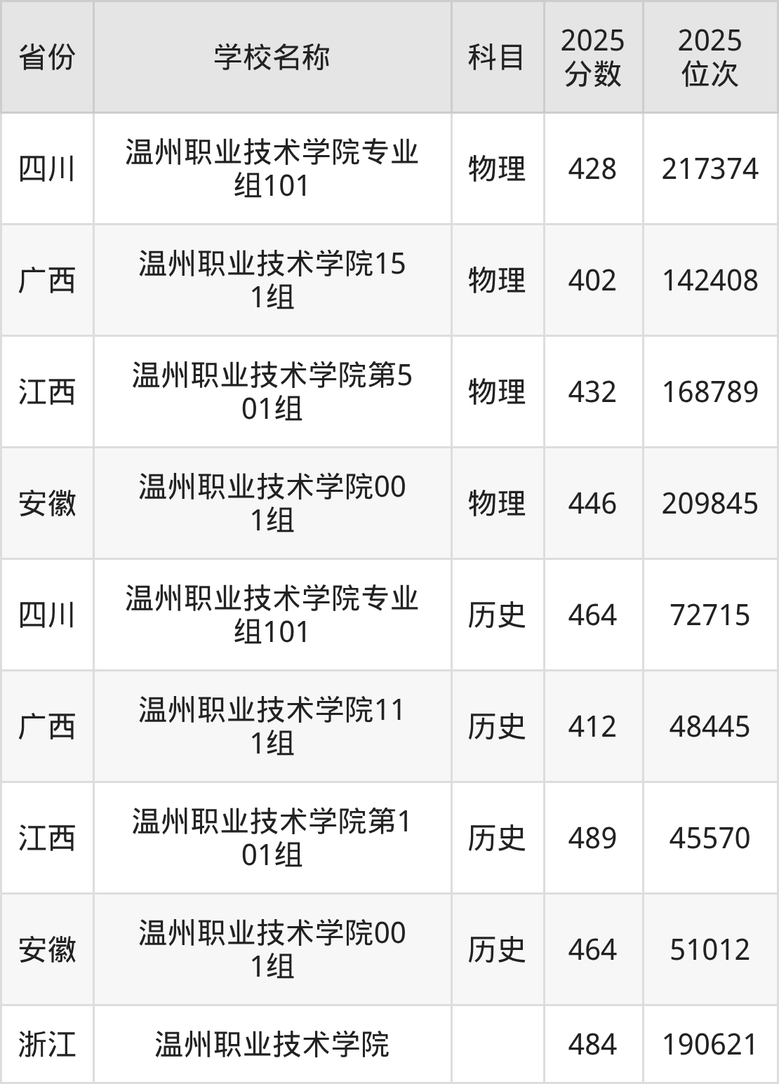 2025年温州职业技术学院在全国各省专科的最低录取分数线在402~489分之间。浙江高考生最低484分能上温州职业技术学院、安徽物理类高考生最低446分能上温州职业技术学院……下文将展示温州职业技术学院在全国5个高考省份中的专科最低投档录取分汇总!