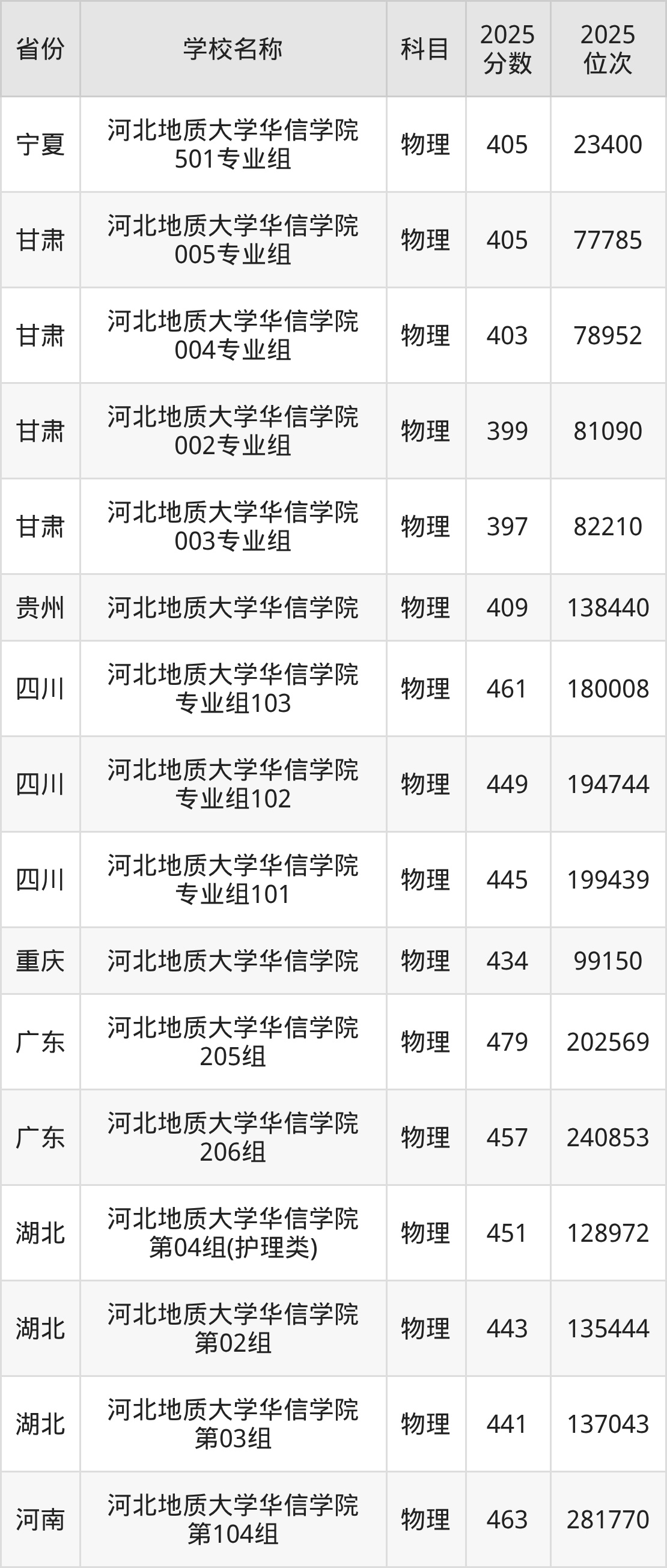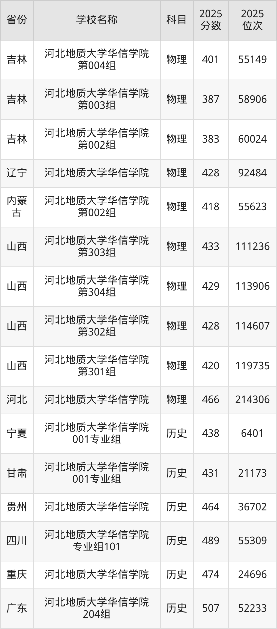 二、河北地质大学华信学院各专业录取分数线