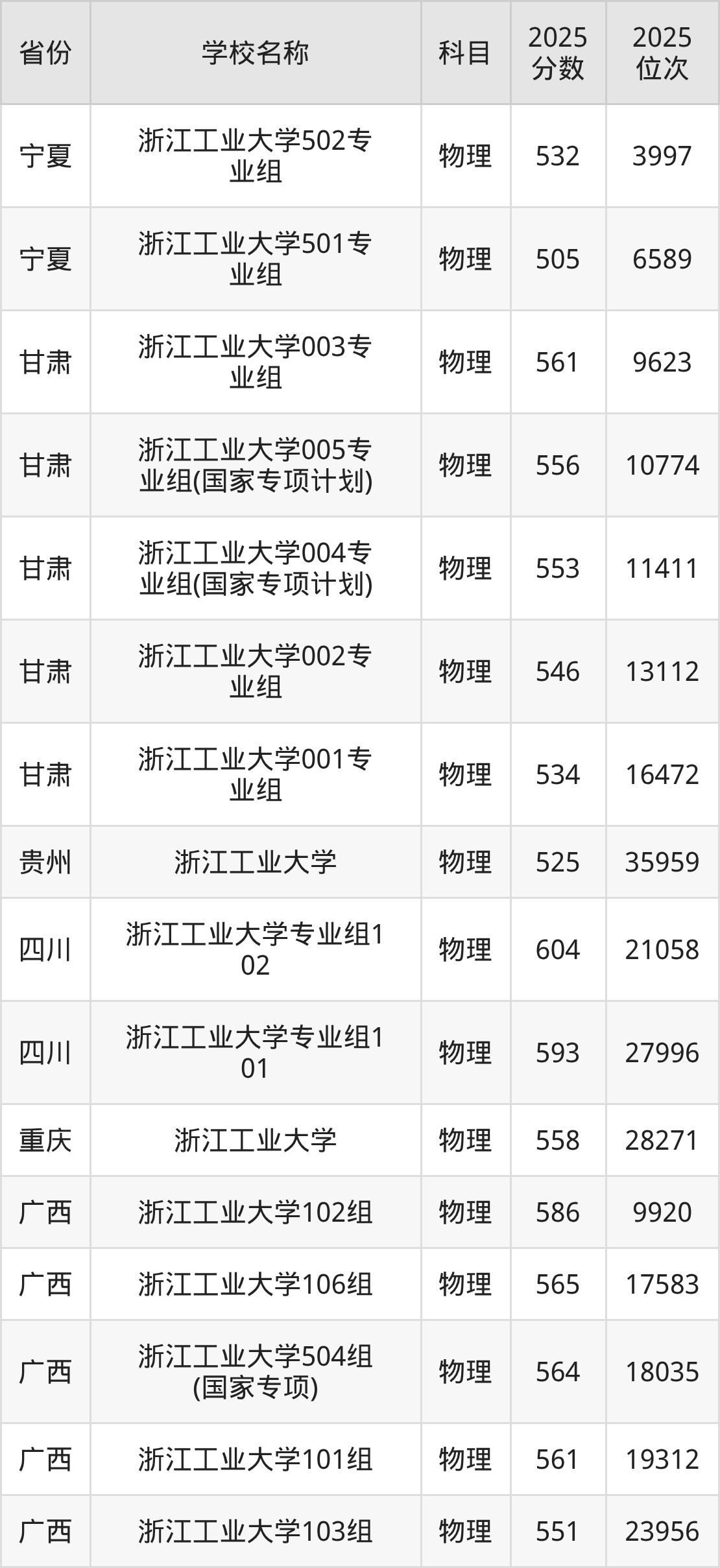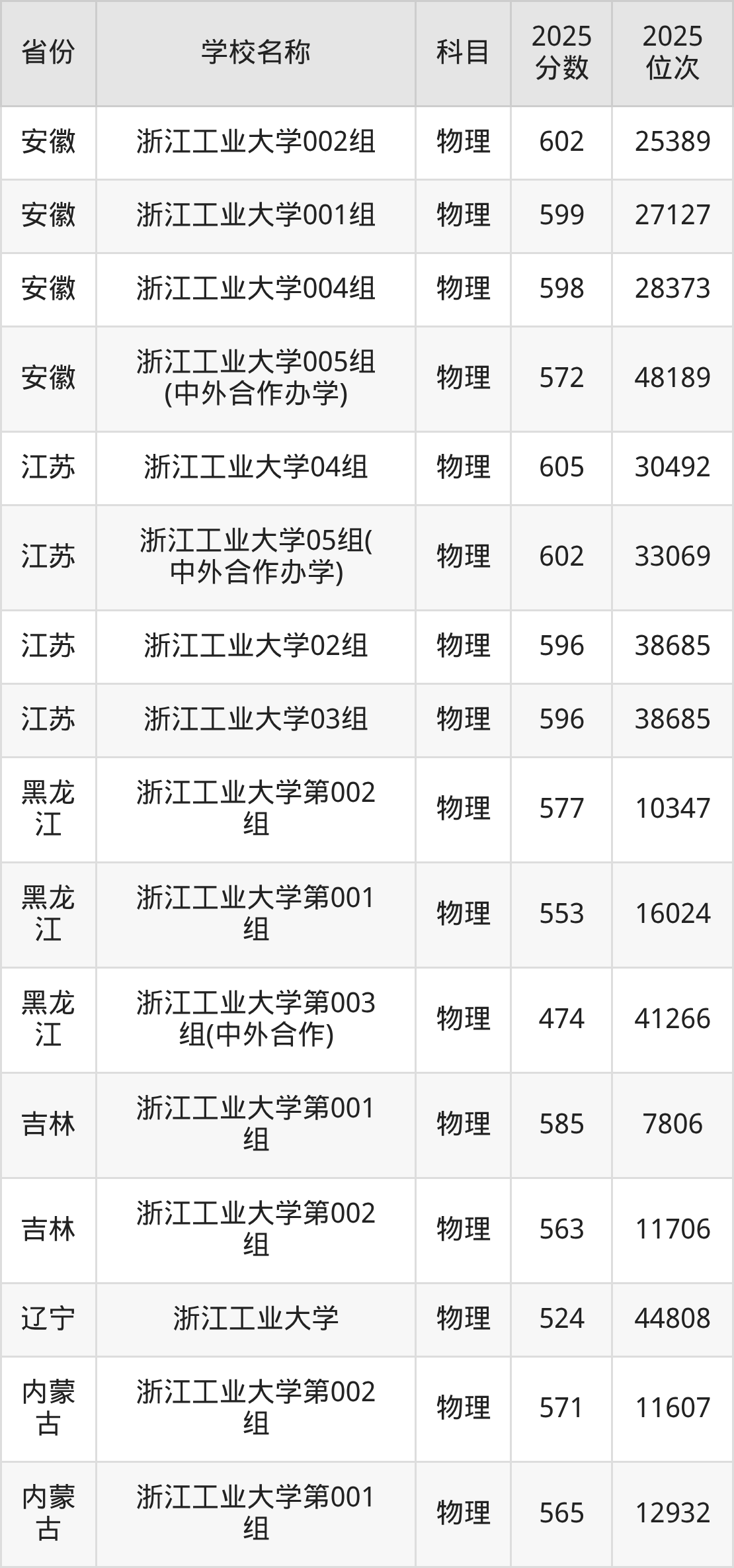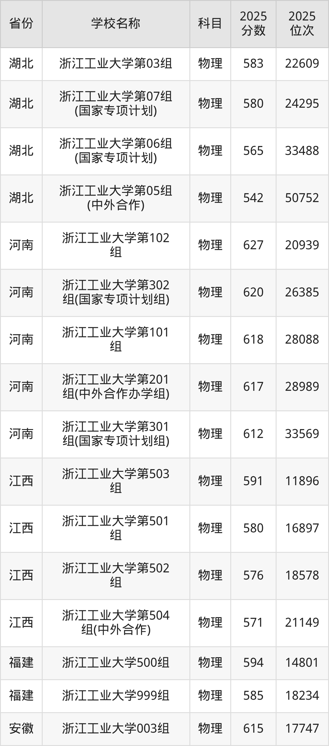 二、浙江工业大学各专业录取分数线