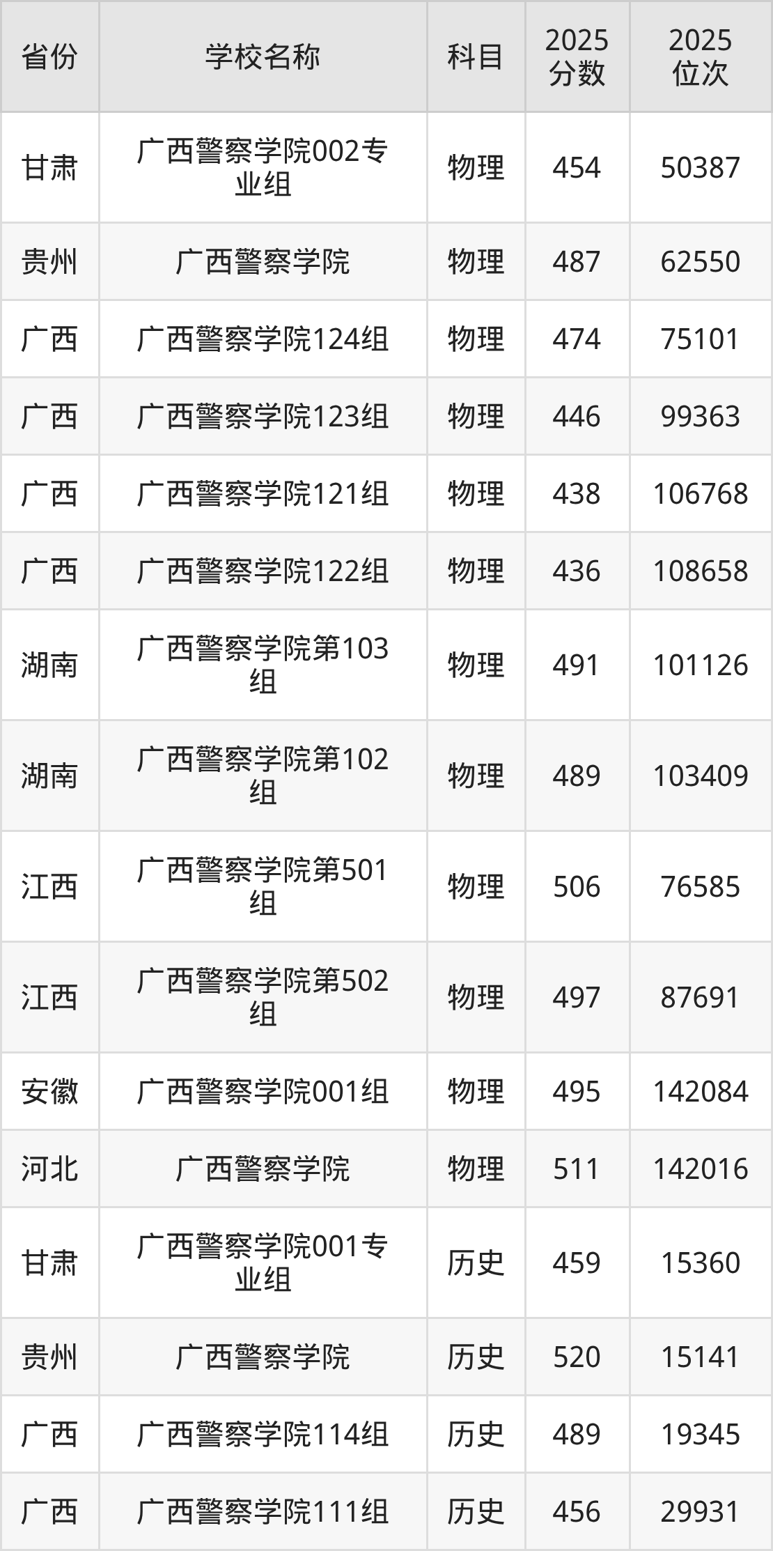 再看广西高考2025年本科批次线,历史类是402分、物理类是370分。通过对比发现:广西警察学院2025年历史类最低分比本科线高34分,物理类最低分比本科线高66分。2026届广西高考生,可通过每一次模考划线,来判断自己的成绩是否有机会被广西警察学院录取。