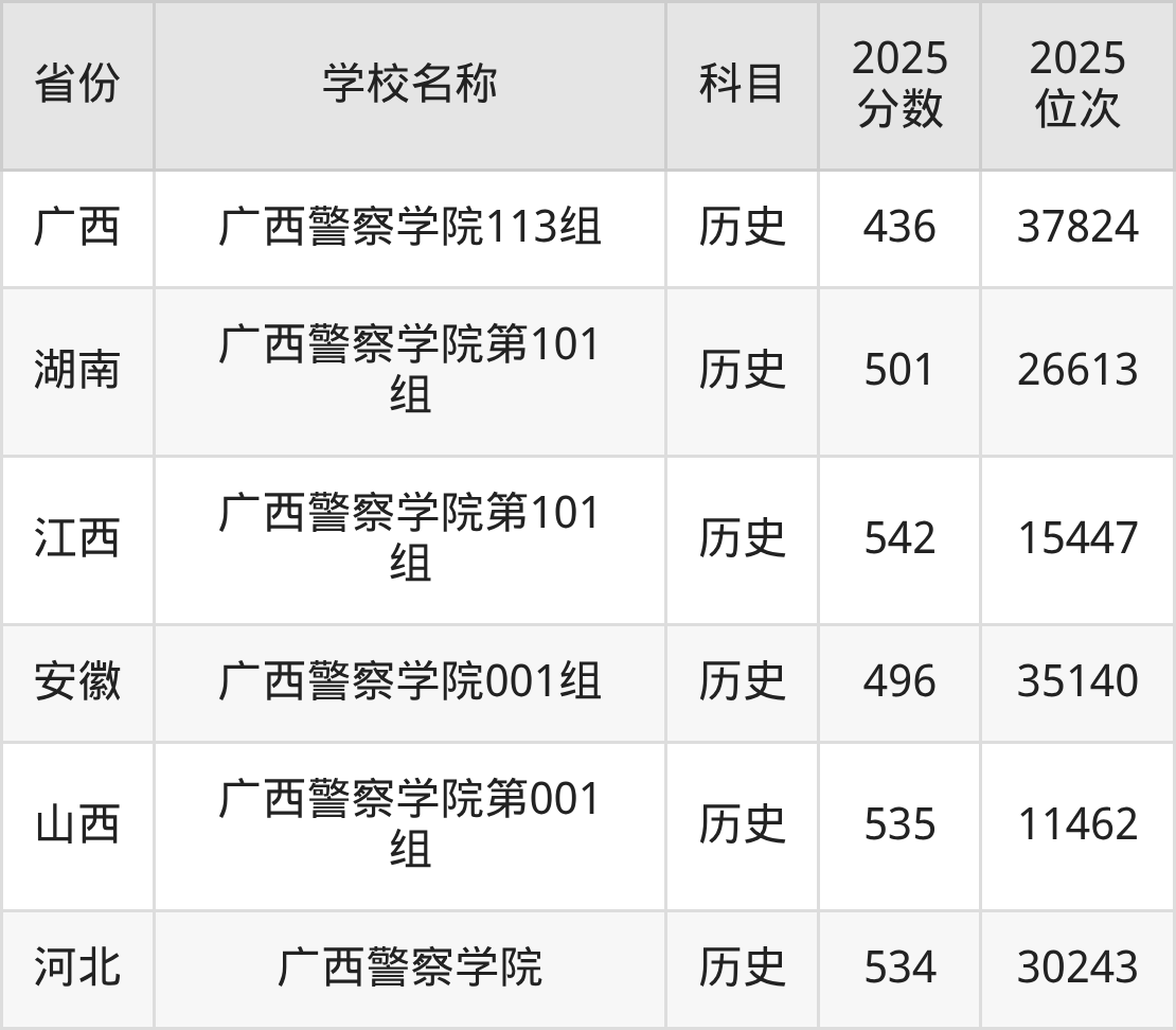 广西警察学院2025年有7个专业组面向广西壮族自治区内首选了历史科目的考生招生: