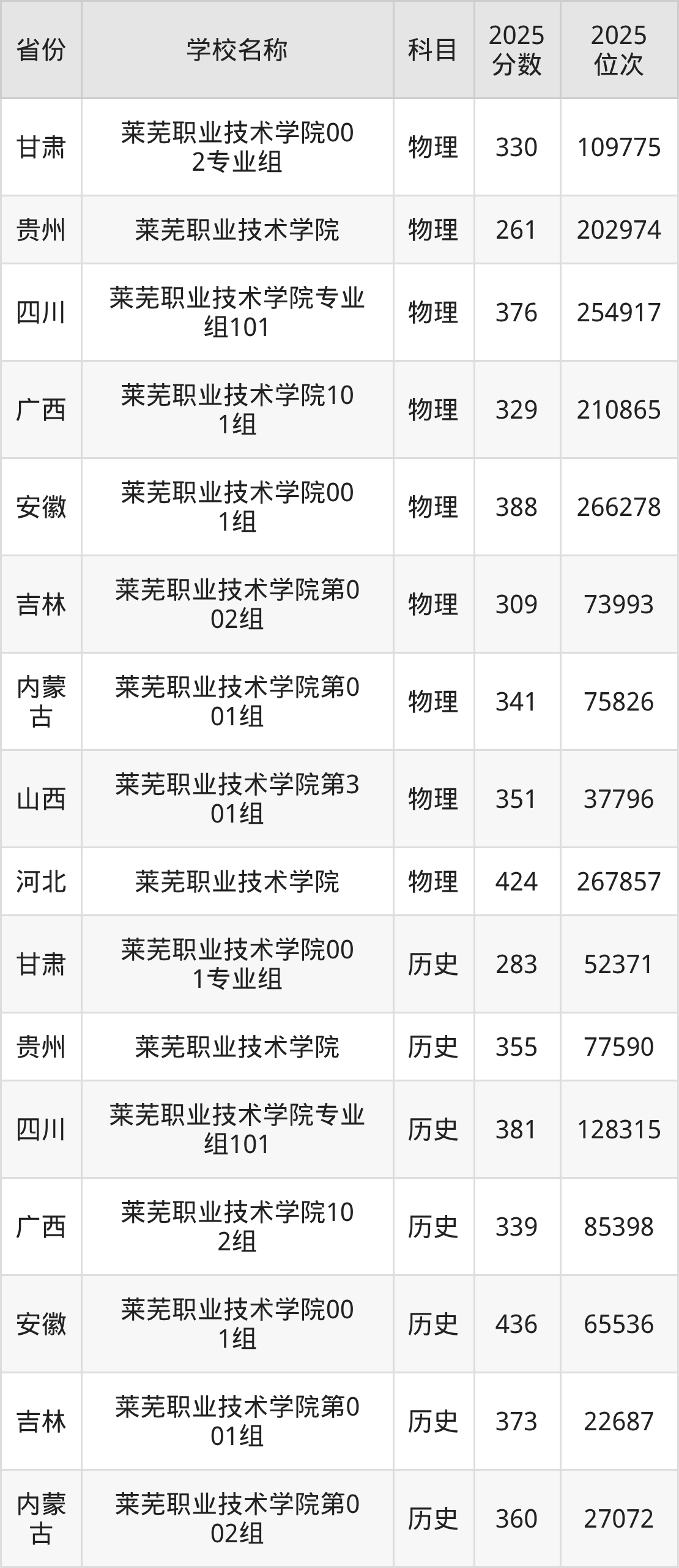2025年莱芜职业技术学院在全国各省专科的最低录取分数线在165~456分之间。河北物理类高考生最低424分能上莱芜职业技术学院、安徽物理类高考生最低388分能上莱芜职业技术学院……下文将展示莱芜职业技术学院在全国11个高考省份中的专科最低投档录取分汇总!