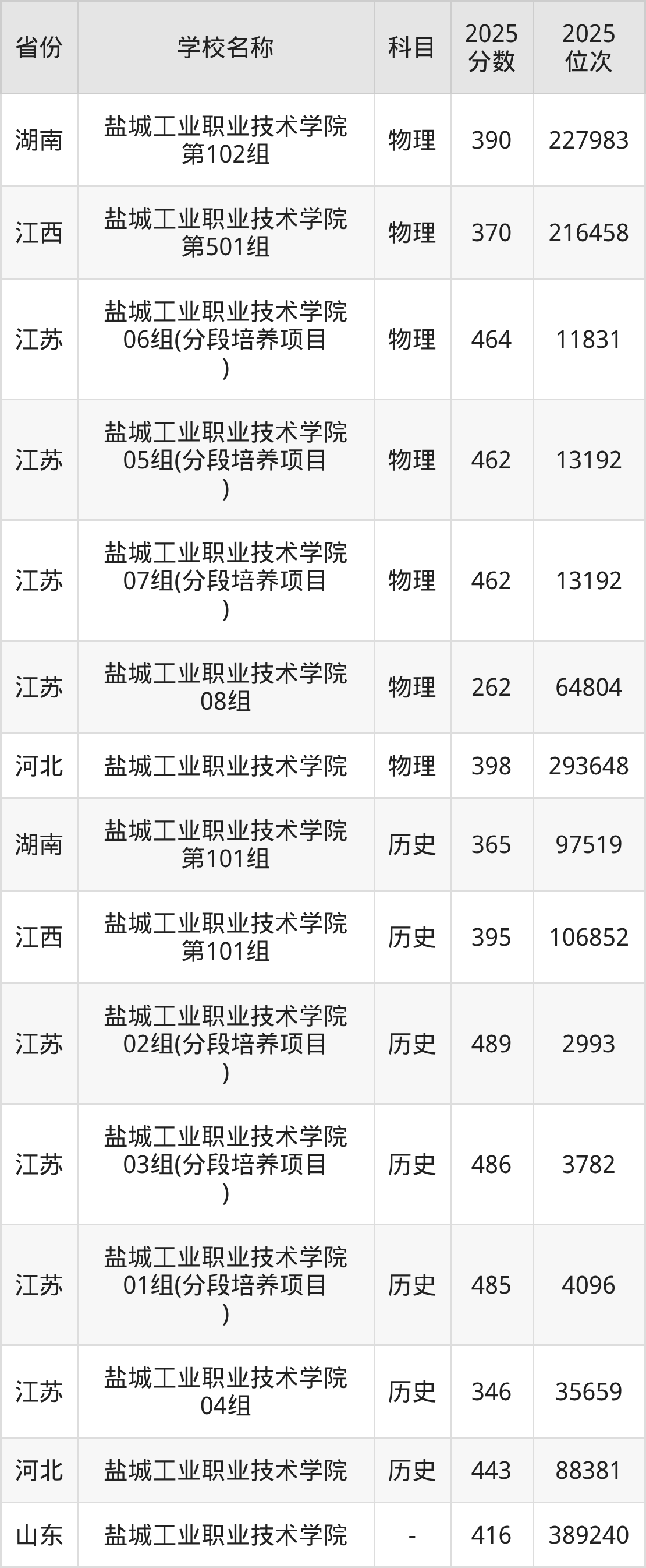 再看江苏高考2025年专科批次线,历史类是220分、物理类是220分。通过对比发现:盐城工业职业技术学院2025年历史类最低分比专科线高126分,物理类最低分比专科线高42分。2026届江苏高考生,可通过每一次模考划线,来判断自己的成绩是否有机会被盐城工业职业技术学院录取。