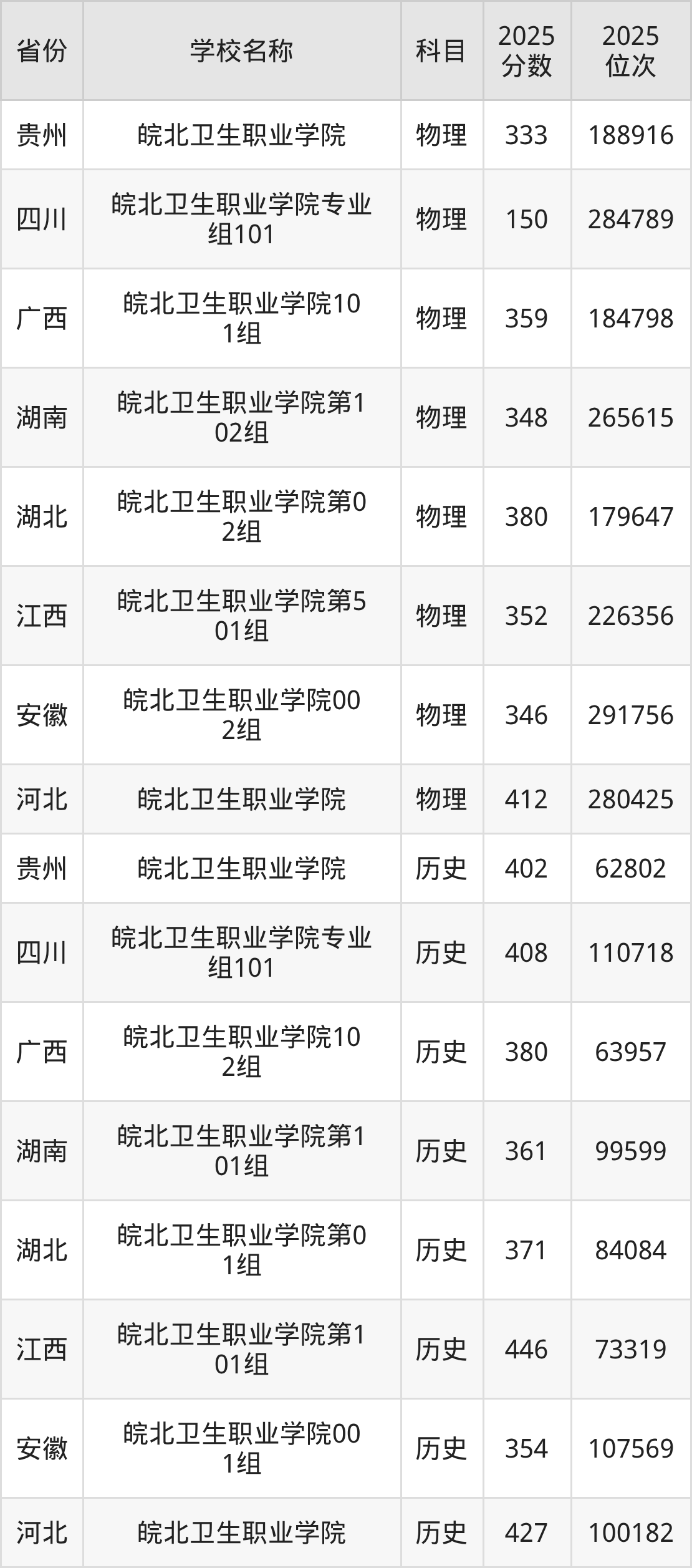 皖北卫生职业学院2025年有1个专业组面向安徽省内首选了历史科目的考生招生: