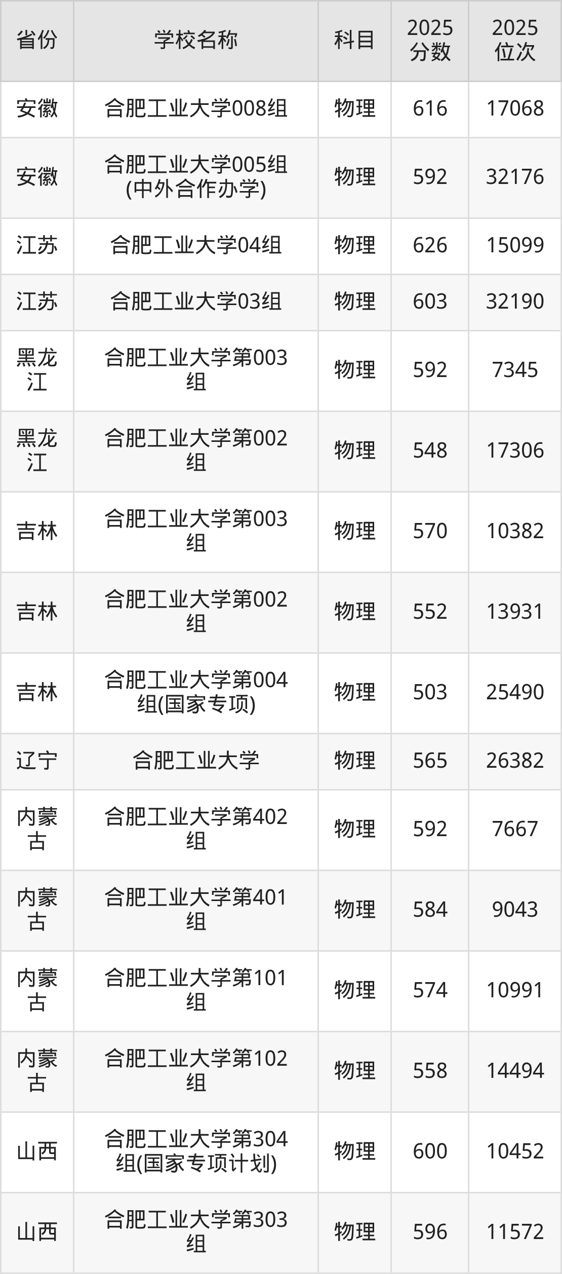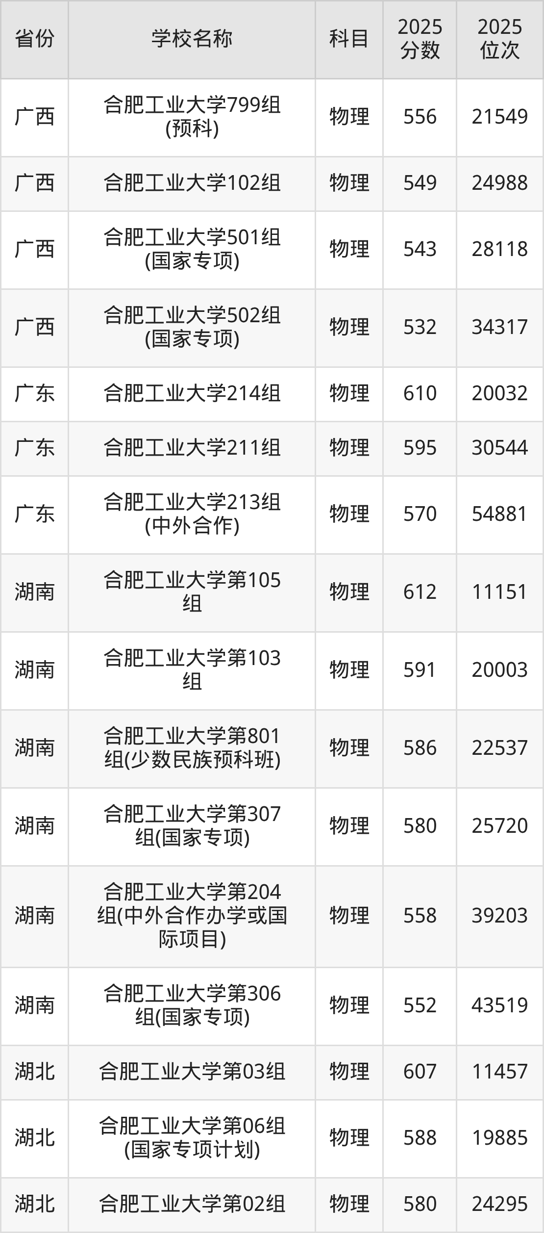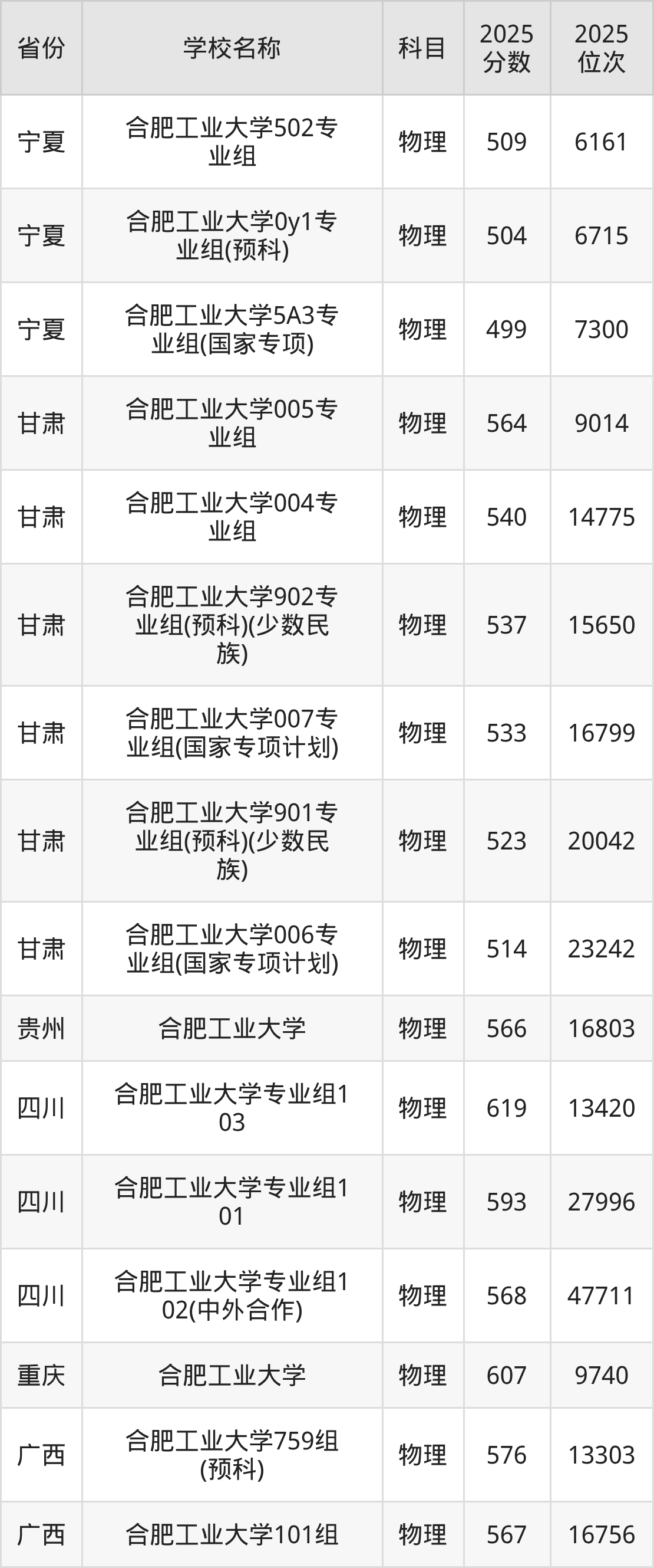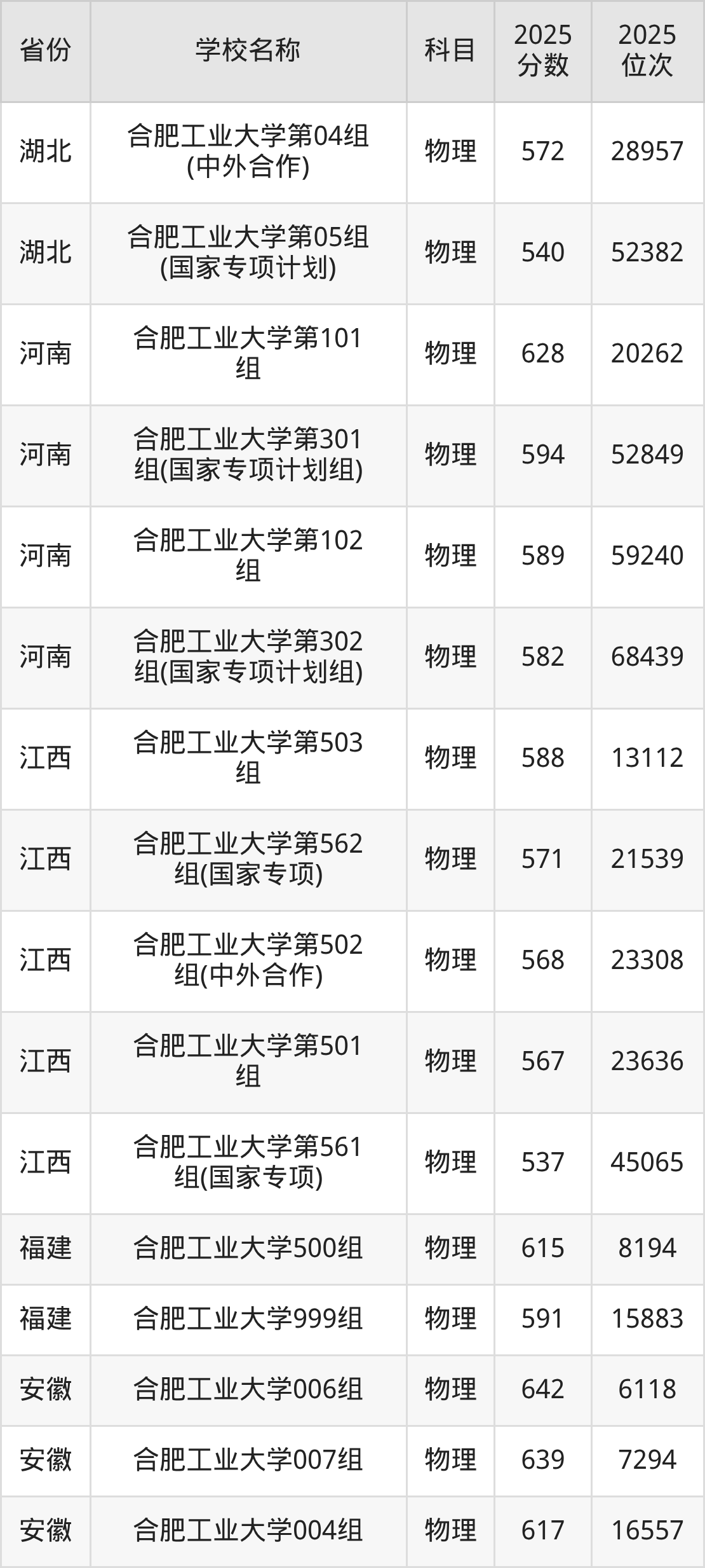 合肥工业大学2025年有5个专业组面向安徽省内首选了物理科目的考生招生: