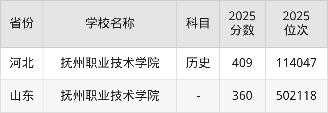 再看江西高考2025年专科批次线,历史类是290分、物理类是240分。通过对比发现:抚州职业技术学院2025年历史类最低分比专科线高59分,物理类最低分与专科线相等。2026届江西高考生,可通过每一次模考划线,来判断自己的成绩是否有机会被抚州职业技术学院录取。