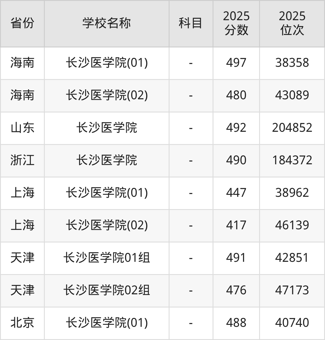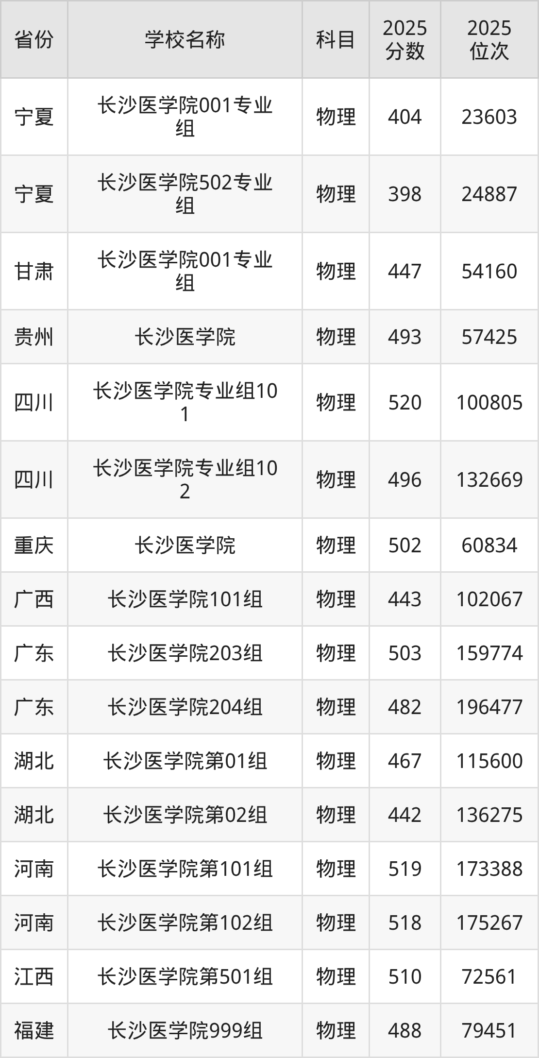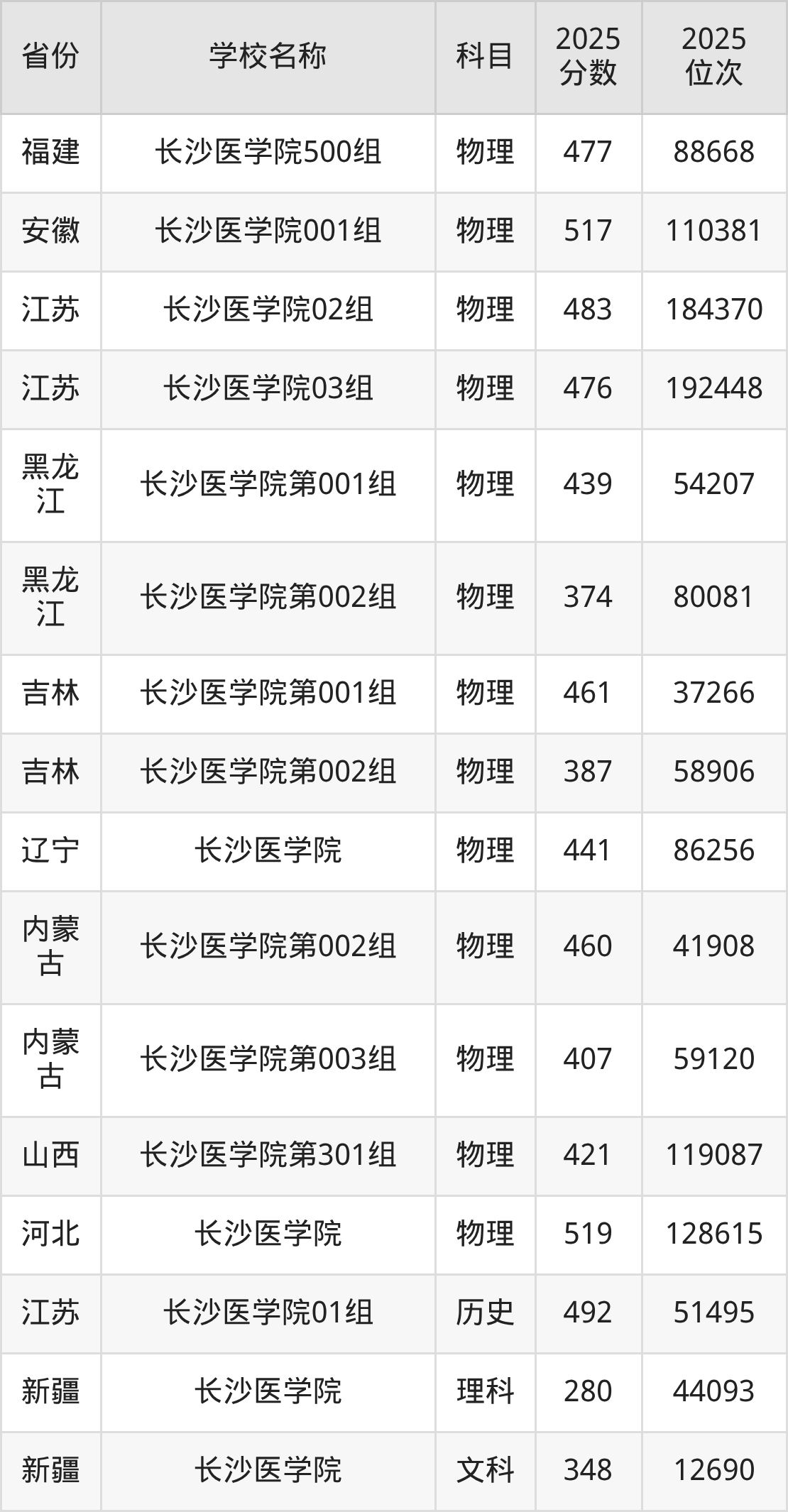 二、长沙医学院各专业录取分数线